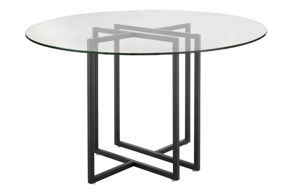 One table that is both sharply angular and perfectly round. The Copeland Furniture Exeter Round Glass Top Dining Table features the signature Exeter base: spans of solid walnut or cherry, arranged with improbable-looking angles that are exceptionally well-balanced and strong as well as visually striking. A round of clear tempered glass on top allows you to appreciate the unique base from anywhere.