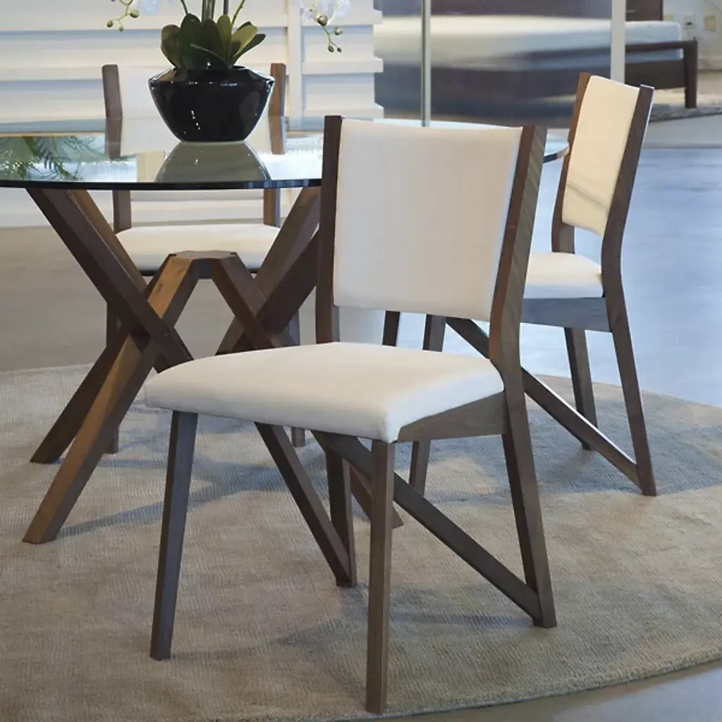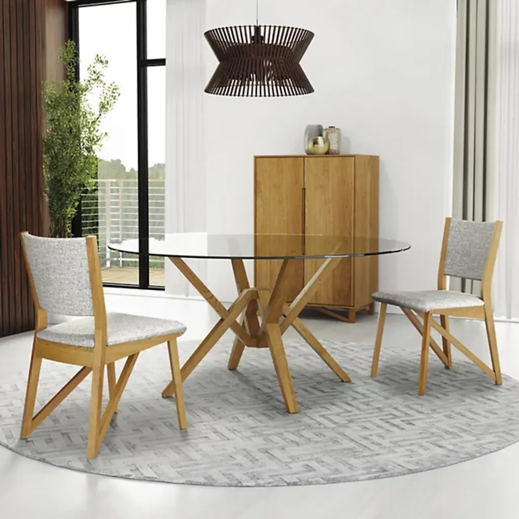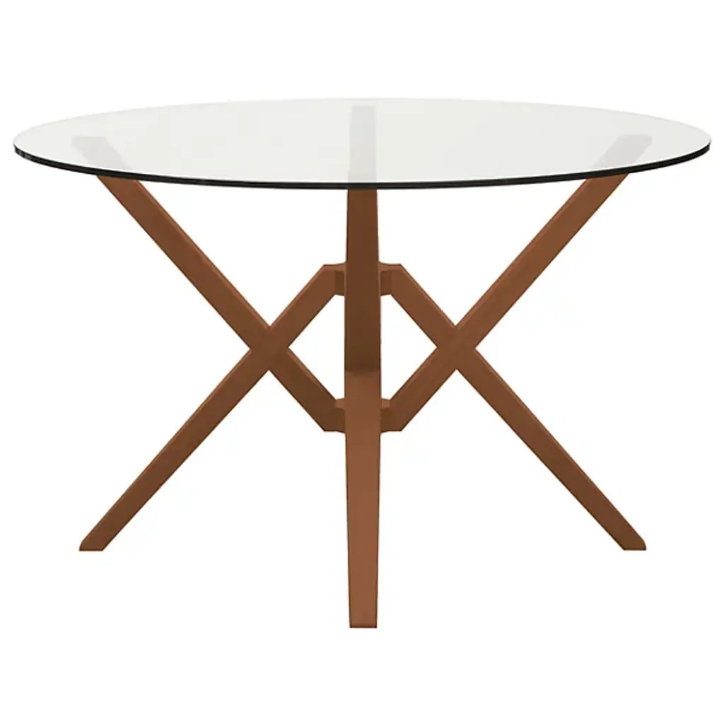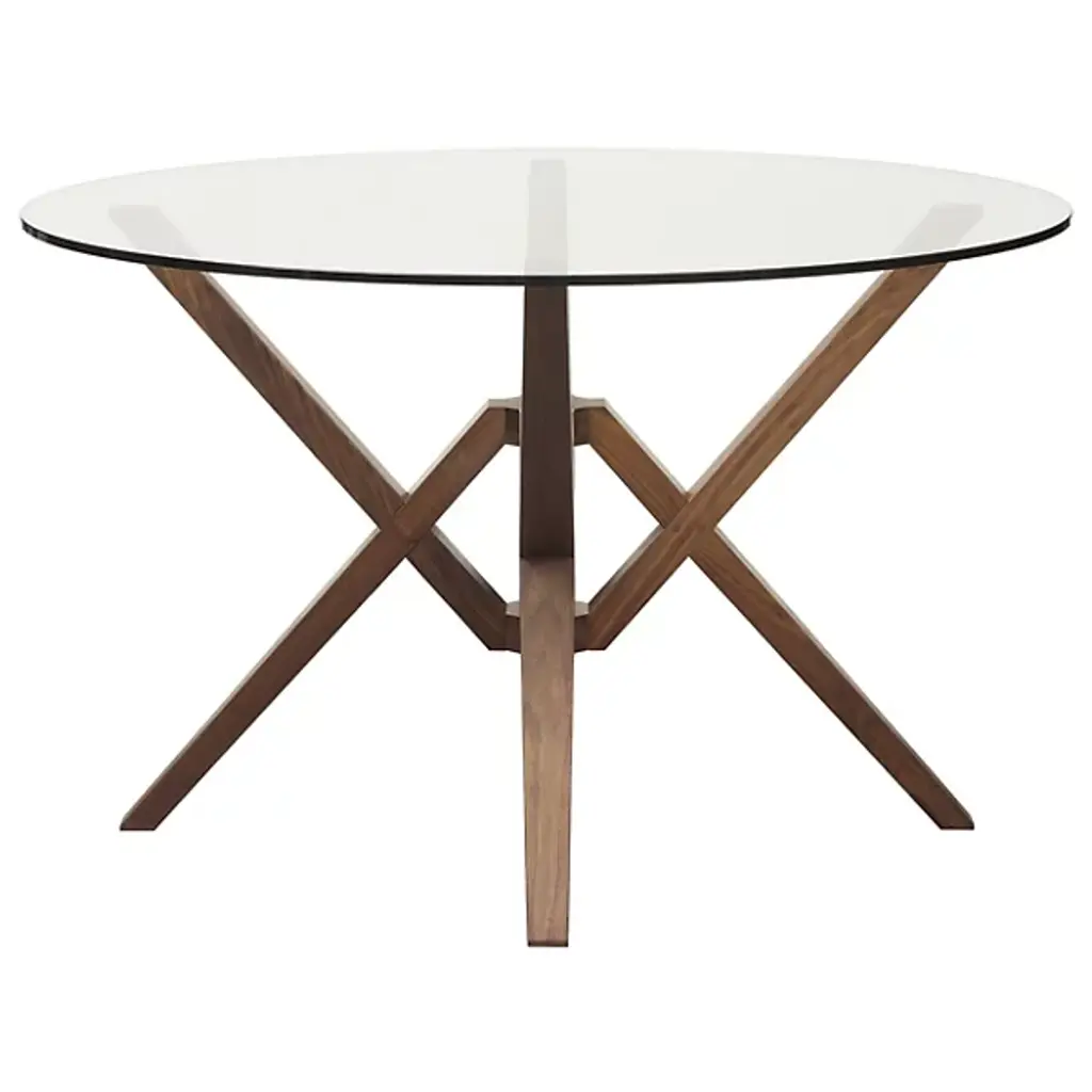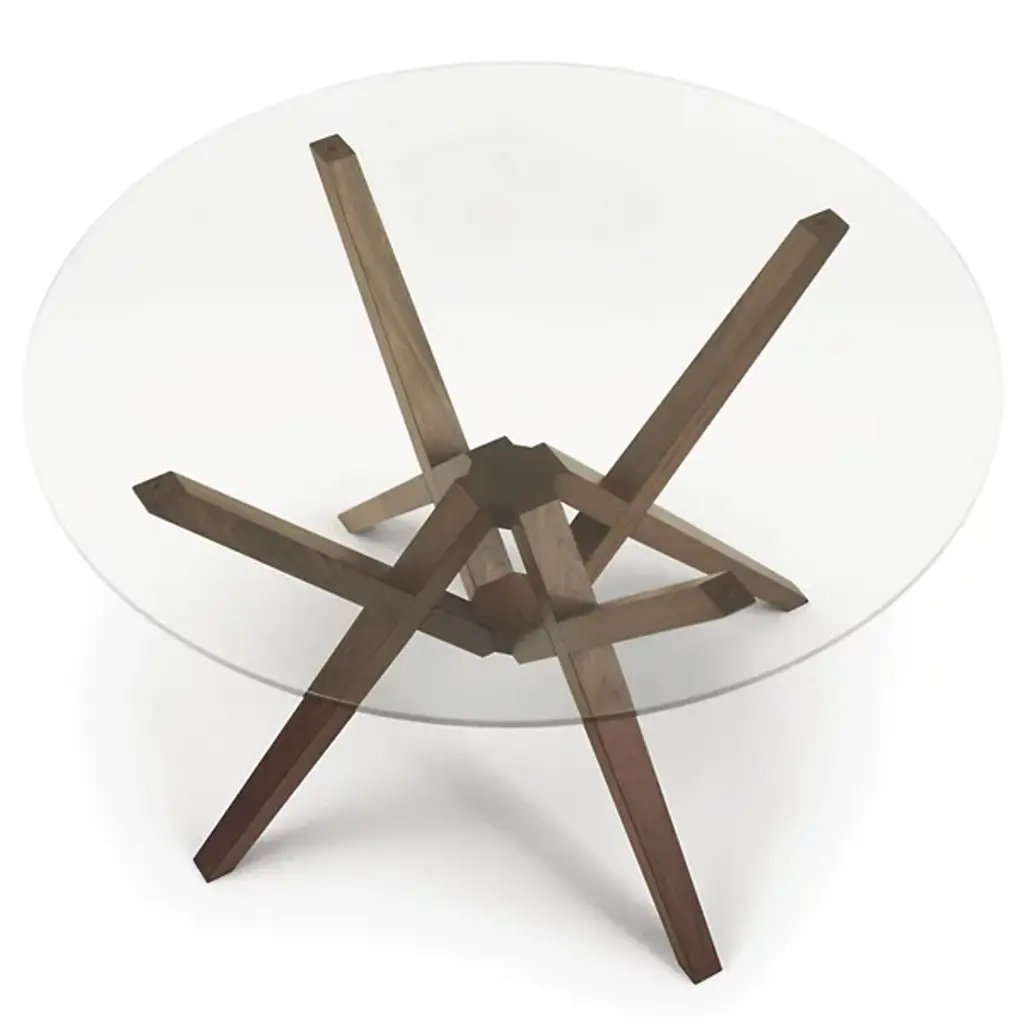 One table that is both sharply angular and perfectly round. The Copeland Furniture Exeter Round Glass Top Dining Table features the signature Exeter base: spans of solid walnut or cherry, arranged with improbable-looking angles that are exceptionally well-balanced and strong as well as visually striking. A round of clear tempered glass on top allows you to appreciate the unique base from anywhere.