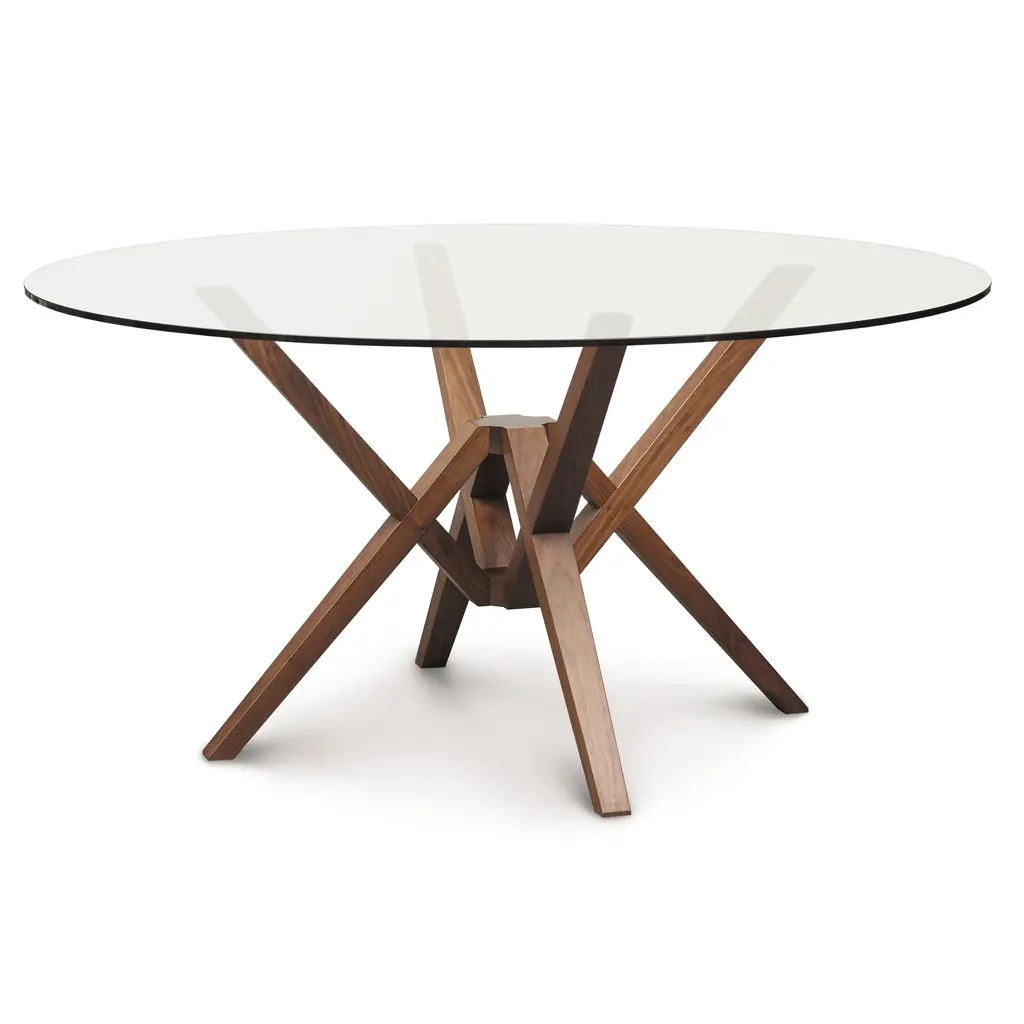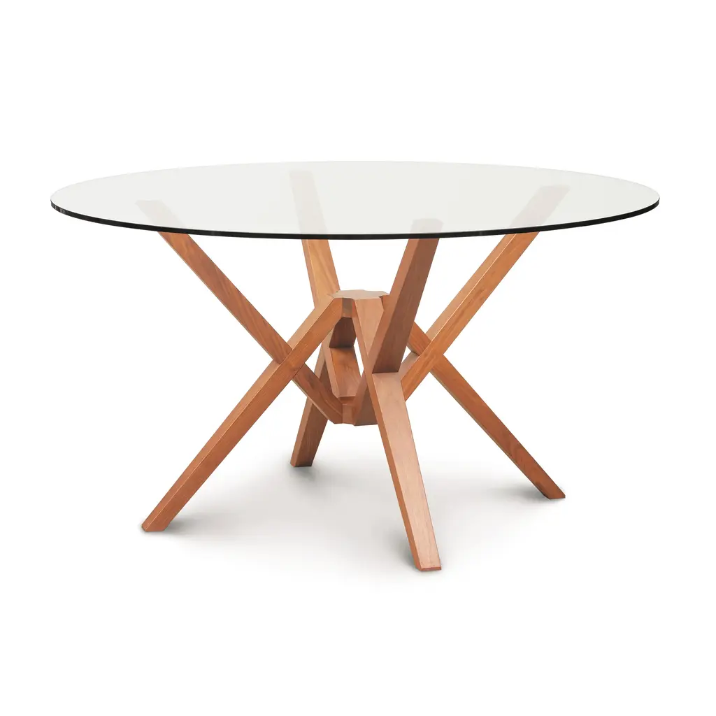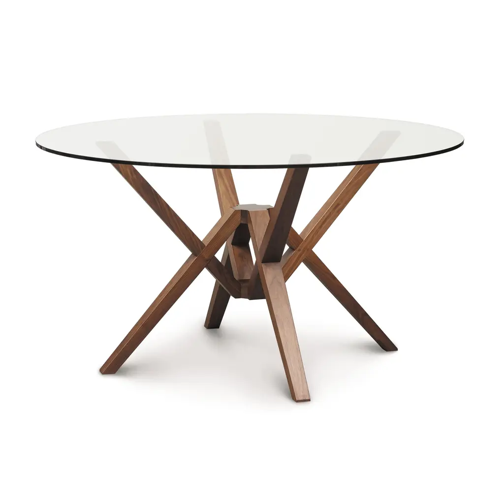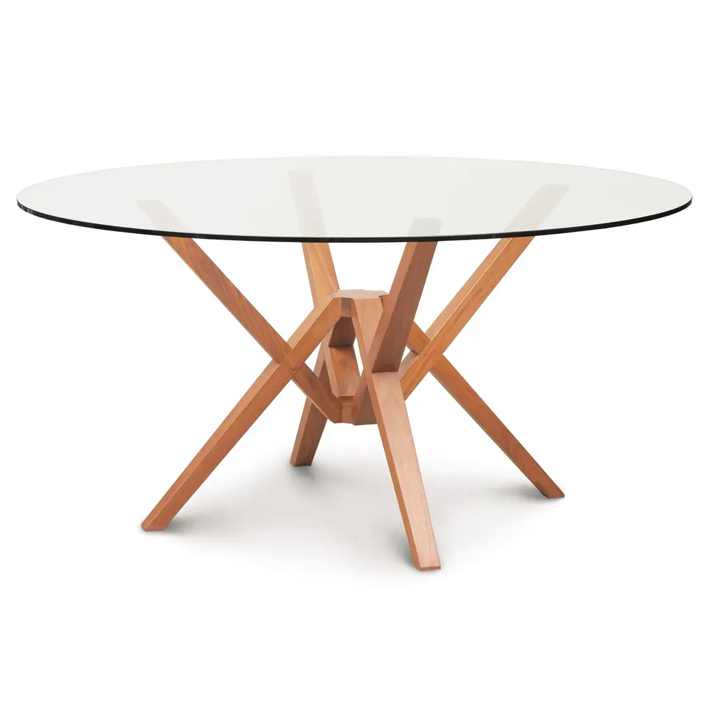 The Exeter Round Glass Top Table from Copeland is a true masterpiece of modern design. Handcrafted in solid hardwood and made to order, it showcases an isometric tension creating a unique intertwined base for striking visual appeal. Pair with the Exeter Dining Chair for a chic and sustainable dining room set up. Highlights