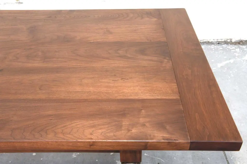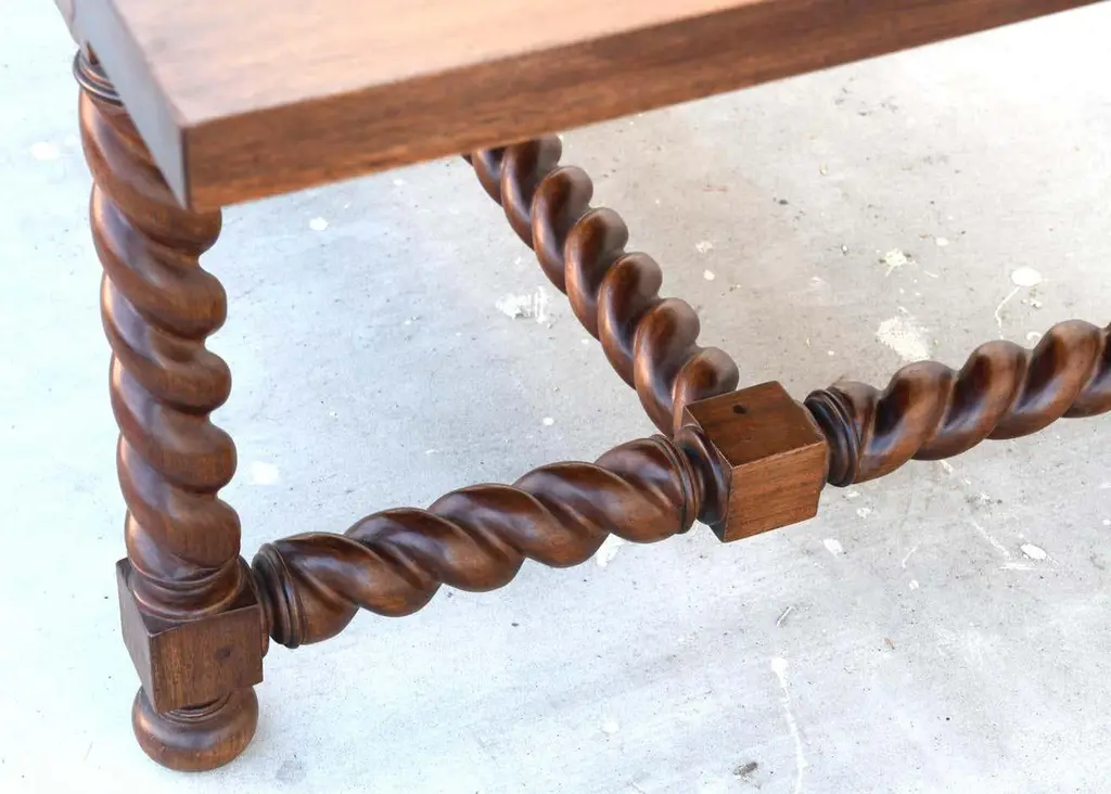 This barley twist dining table is shown here in 108" x 40", expanding to 138". We use only traditional carpentry techniques, no nails or metal fasteners of any kind. Just mortise and tenon construction reinforced with handcut wooden dowels.