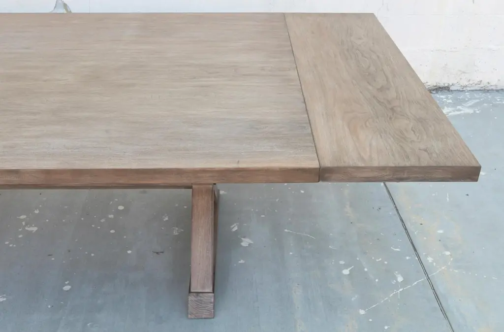 This walnut dining table is seen here in 113" x 48" expanding to 143" using 2x 15" extensions, however it can be built in any size.Because each table is bench-made in our own Los Angeles workshop you can influence all aspects of design, including size, wood species and finish. We use only traditional carpentry techniques, no nails or metal fasteners of any kind. Just mortise and Tenon construction reinforced with handcut wooden dowels.If you require customized overhang dimensions please stipulate with order.