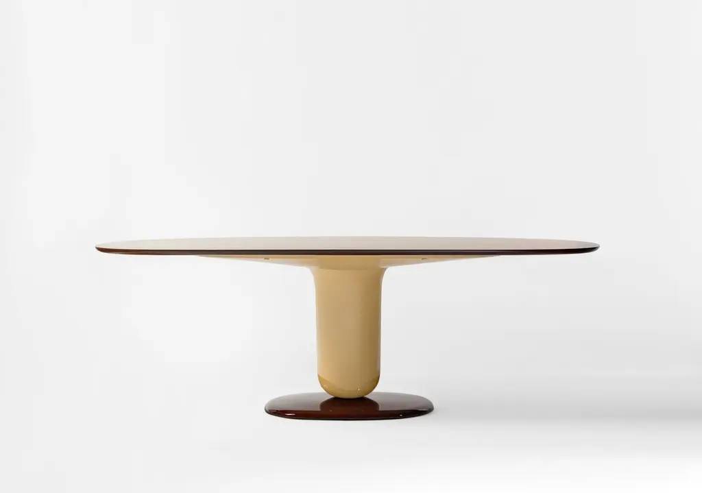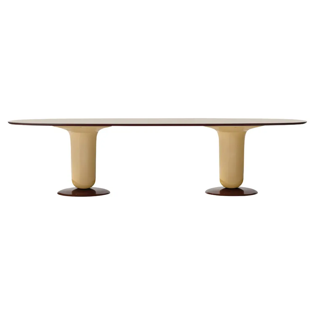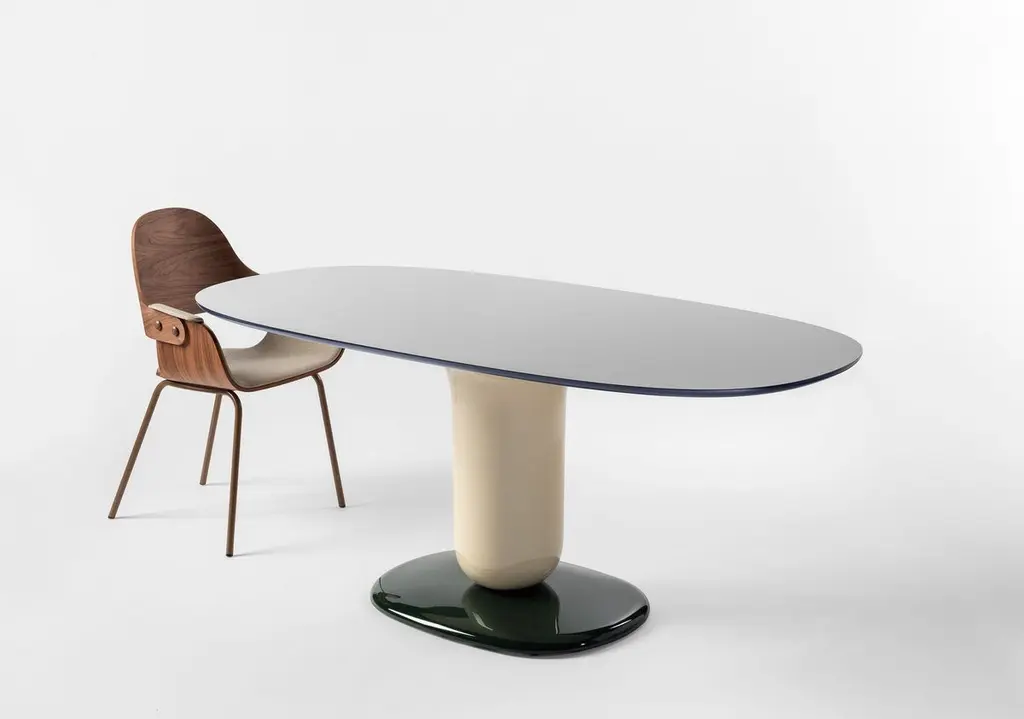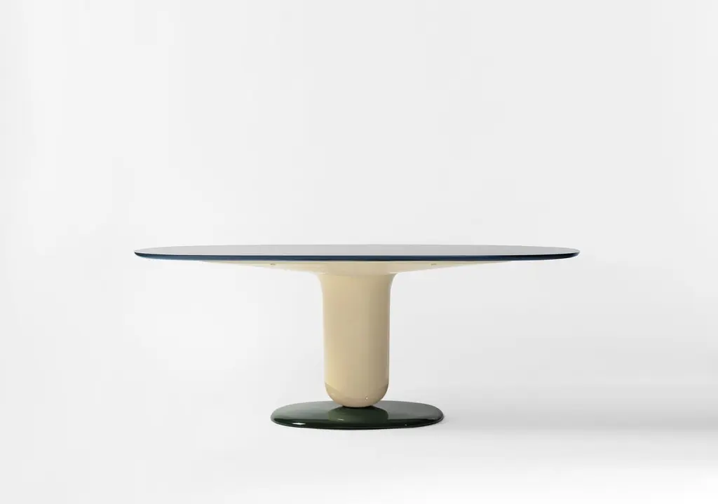 Explorer 5B dining table by Jaime HayonDimensions: D 100 x W 220 x H 74 cm Materials: Lacquered fiberglass body. Solid turned wooden legs and lacquered. Painted glass tabletop.Available in sizes Explorer 4 (Diameter 130 cm) and Explorer 5A (Diameter 190 cm). And also available in monochromatic colors.In 2019 we presented a series of three side tables called Explorer 1, 2, and 3. So far these pieces have had great success and now we present addition to this collection. The tables have expanded in growth, maintaining the same signs of identity in personality, pleasantness, elegance, and quality in workmanship. Three table top sizes are available in different colors, with new pieces being added to the collection that will be coming out soon. Indoor use only. In 1972, a group of young architects and designers from Barcelona created BD with the aim of producing and marketing furniture and other objects for our projects, with complete creative freedom and with a criterion that has turned out to be quite different from the norm at companies in the sector, regarding both the shape and function.