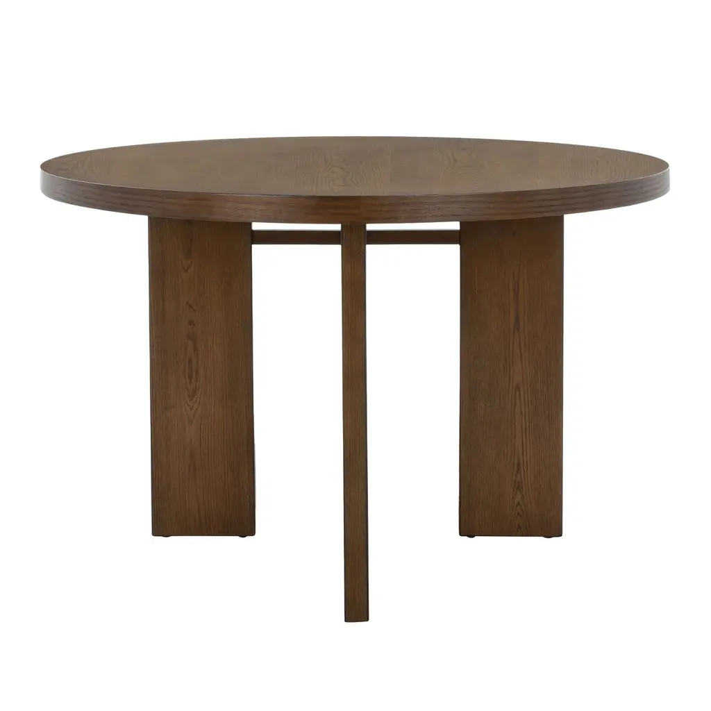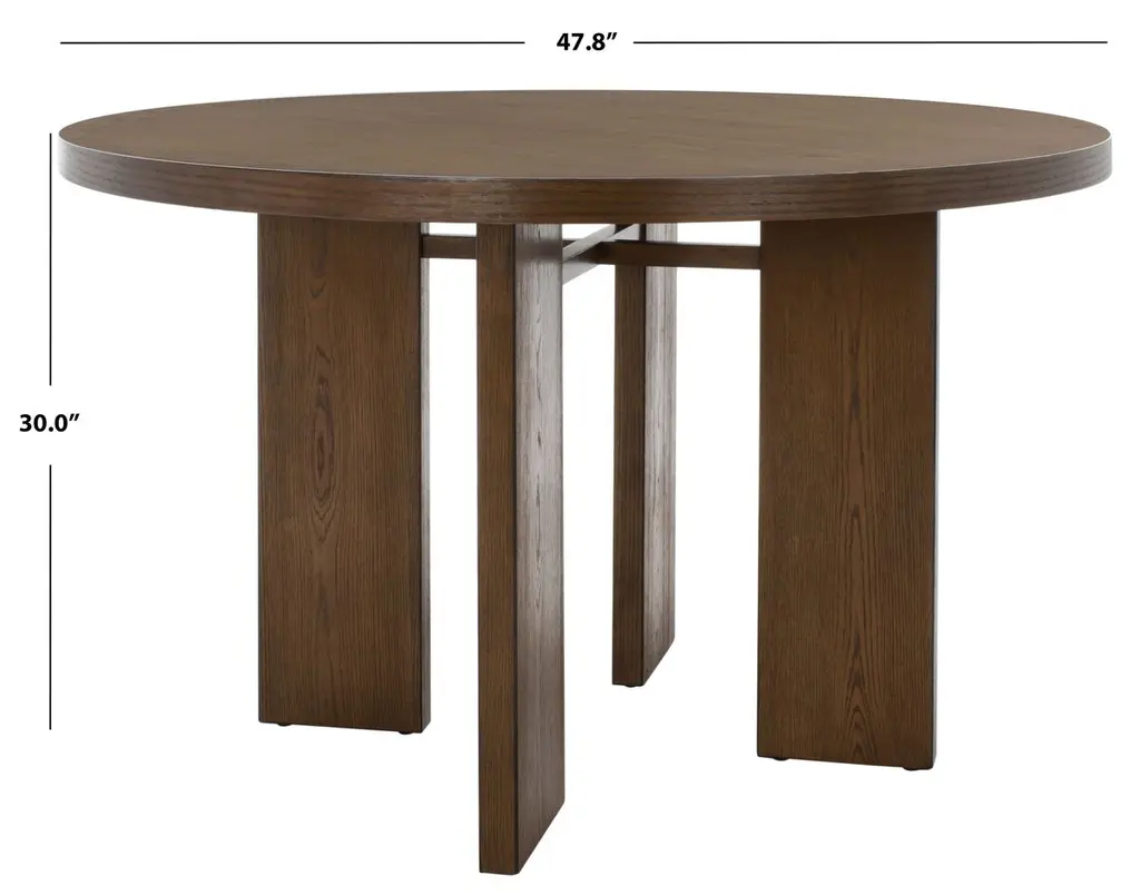 Enliven your home with the sleek and minimal charm of our Fable dining table. Clean-lined and refined, our perfectly rounded table sits upon slender rectangular legs. The legs are angled perpendicularly to lend a simple yet striking visual play. The table is enriched with an oak veneer to create a beautiful display of its rich organic grains. Charming and versatile, our dining table remains a welcoming addition to your kitchen or dining area, comfortably seating four individuals.