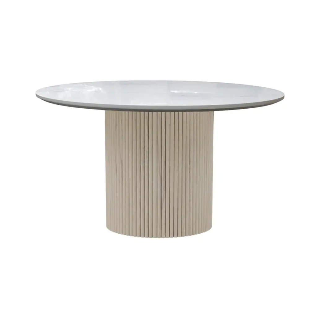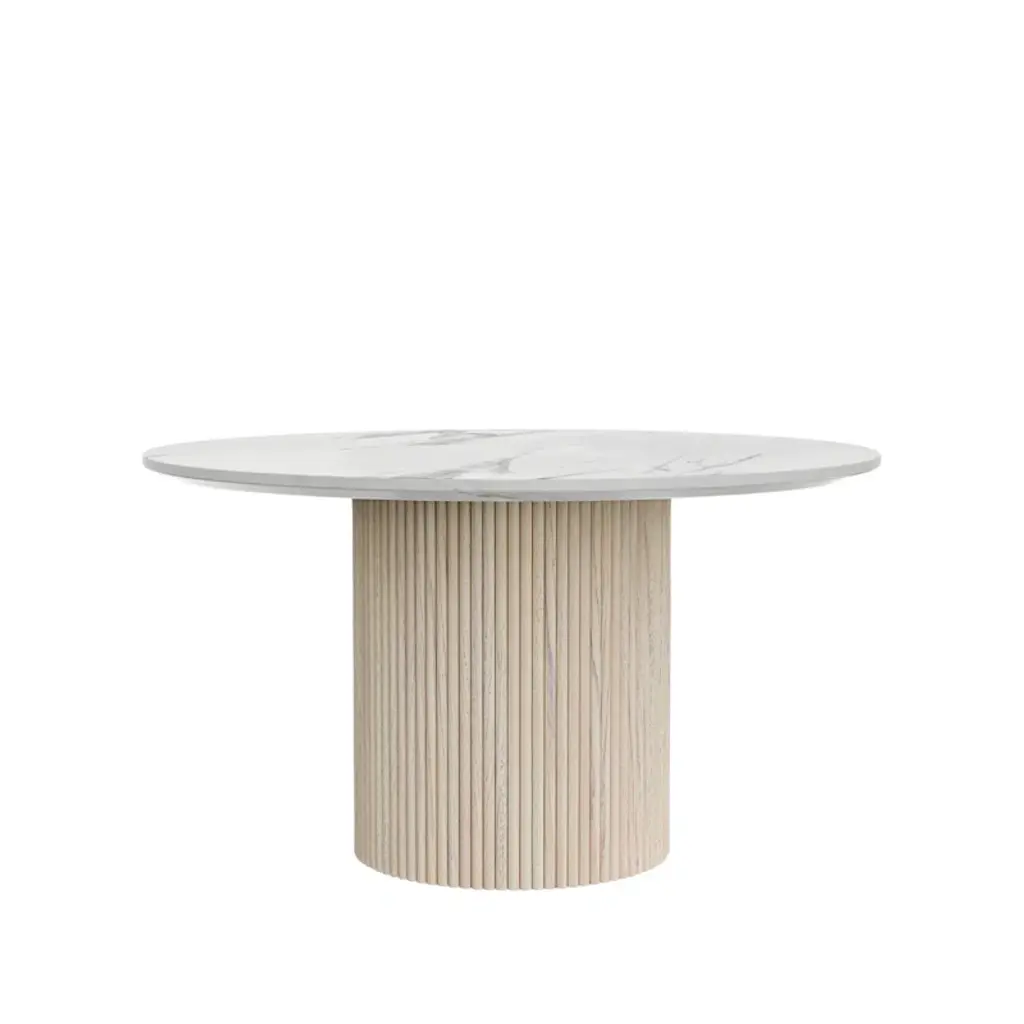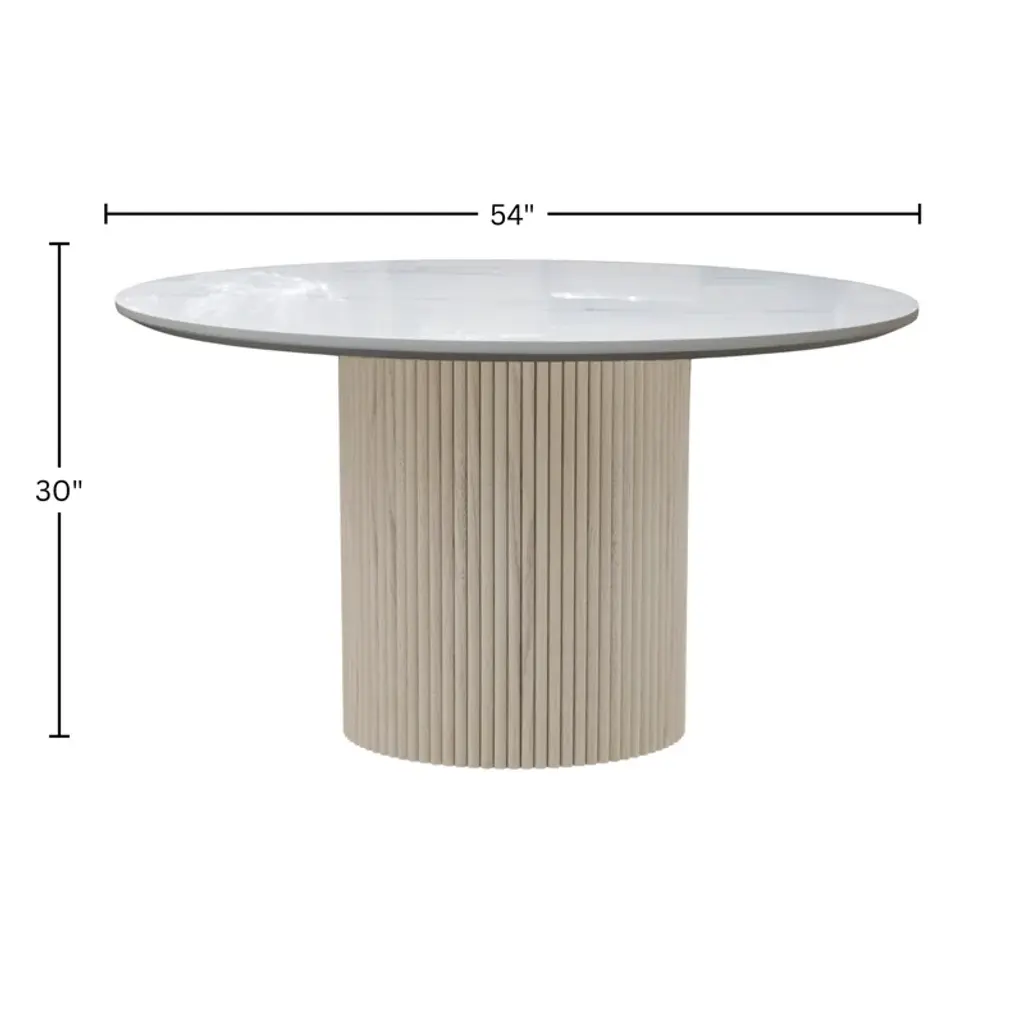 Elevate your dining experience with the effortlessly chic Reba Round Dining Table—a perfect harmony of natural textures and modern sophistication. Designed with intention and crafted with care, the Reba table features a beautifully ribbed cylindrical base made from solid mindi wood and oak veneer, bringing an organic warmth to your space. Whether you prefer the earthy charm of the white wash or the bold elegance of black, Reba adapts to your style.Choose between a matching wood top or a luxurious quartz surface for a refined yet durable centerpiece. With its generous 54" round top and compact 24" base diameter, Reba is as functional as it is stylish—ideal for intimate dinners or vibrant gatherings.