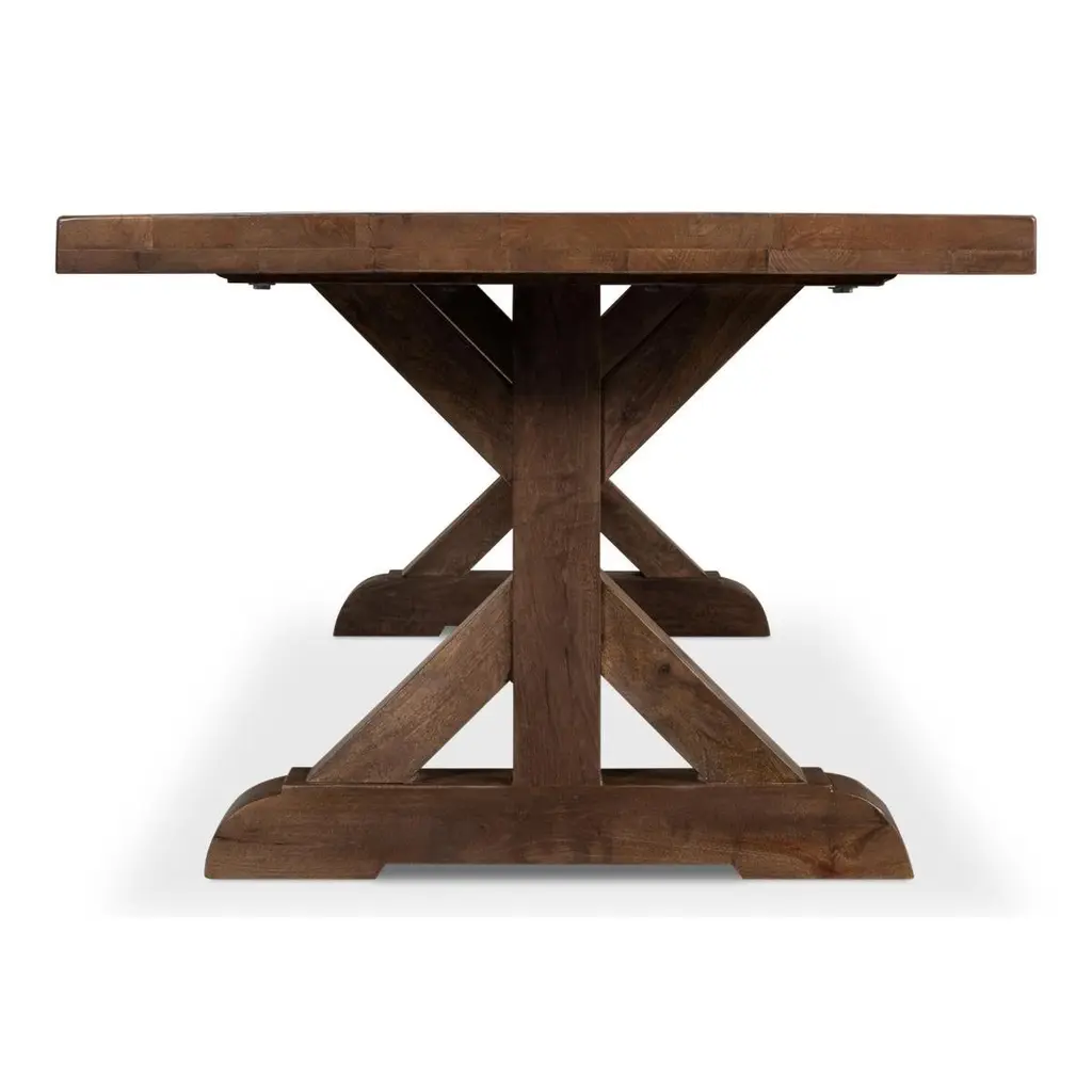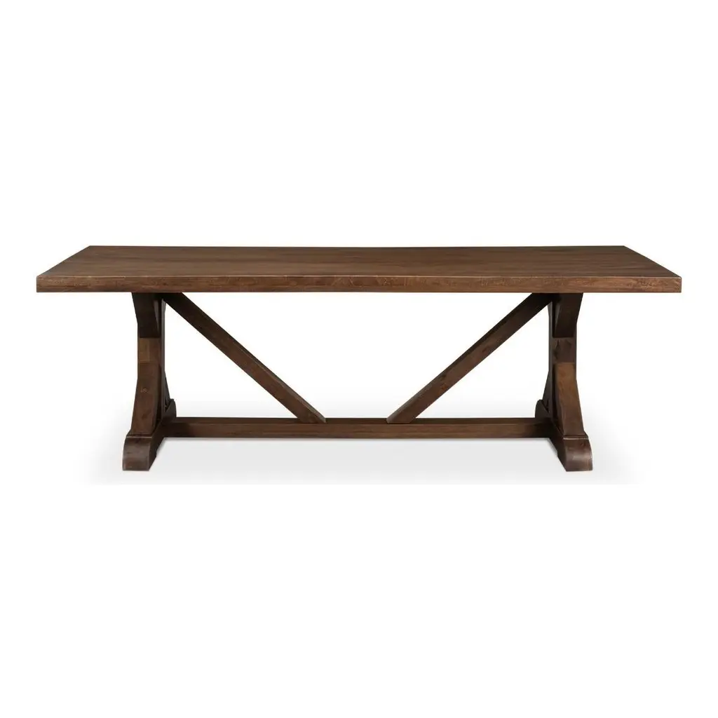 Farmhouse Refectory dining table is constructed of reclaimed wood in a walnut finish, with trestle end supports and a stretcher base.Dimensions: 95" W x 39" D x 31" H.