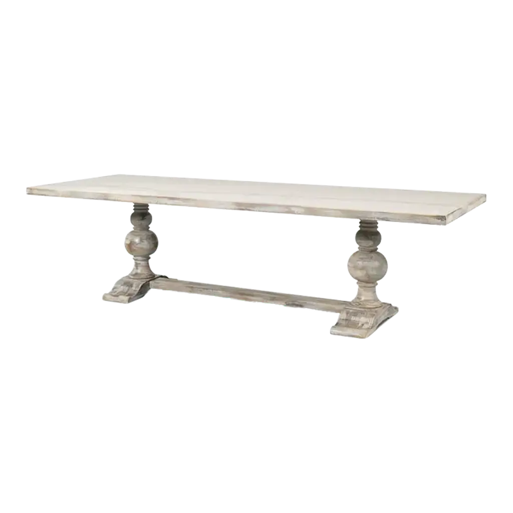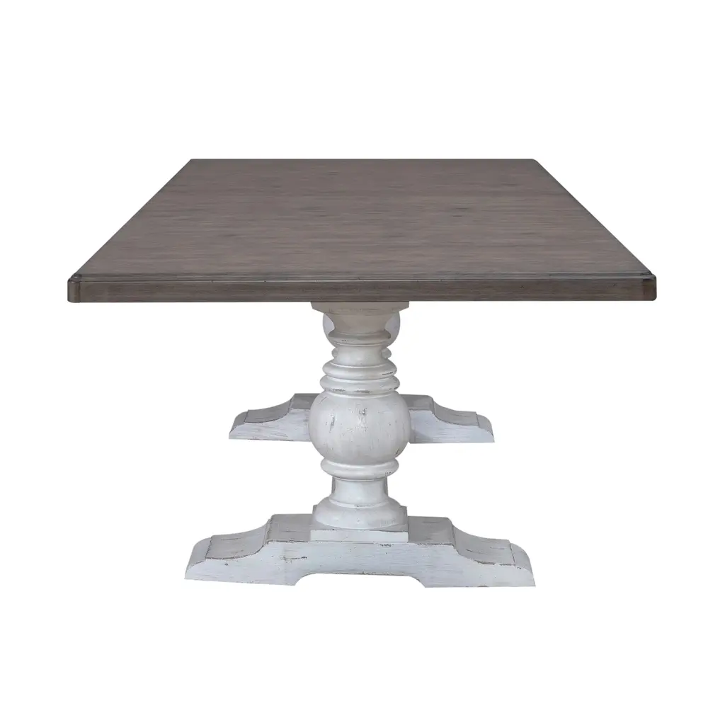 Designed to entice a sense of calm and tranquility into interior spaces, the River Place trestle table strikes the perfect balance of life on the coast and a comfy home tucked away in the hills. Crafted of Pine solids and veneers, this table features a heavily distressed Riverstone White and Tobacco finish. The trestle table includes a removable and self-storing eighteen inch leaf on an easy glide leaf track system to make expansion a breeze. The top offers softly rounded edges with step molding that flow to the heavy turned pedestals with a center trestle to ensure stability. The River Place trestle table creates an inviting airy atmosphere in your home while providing comfort in your own private getaway.