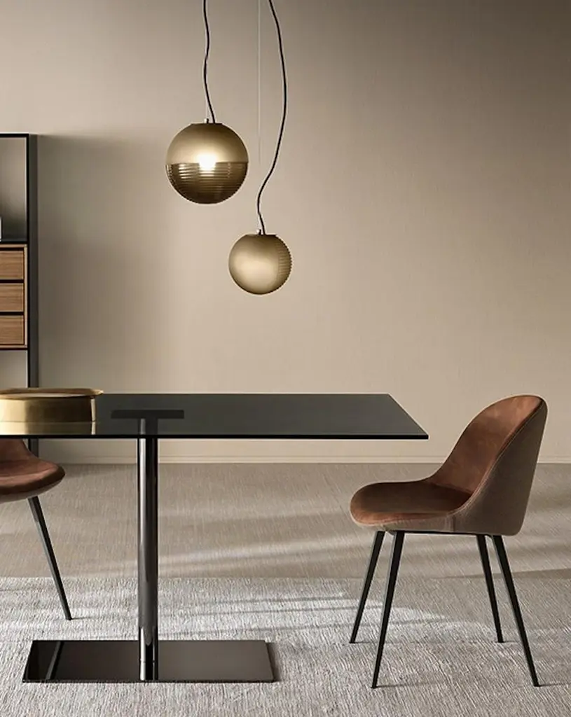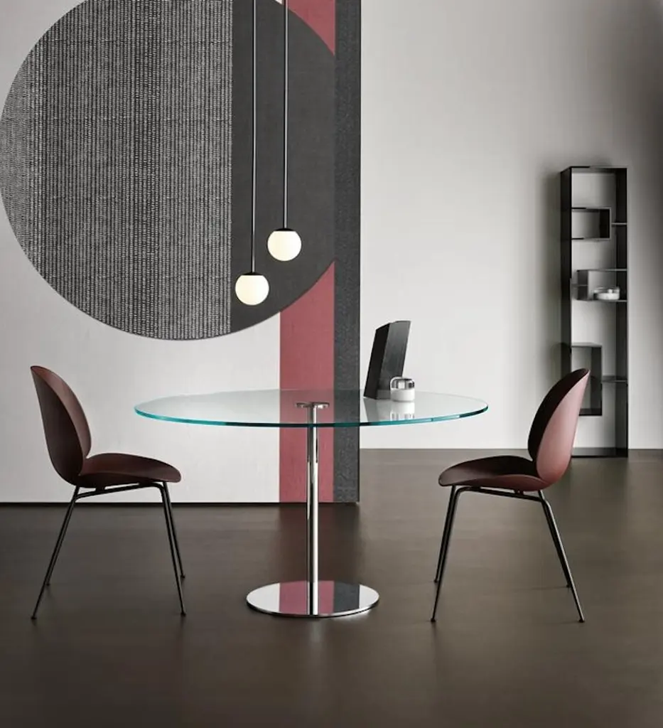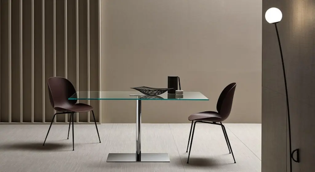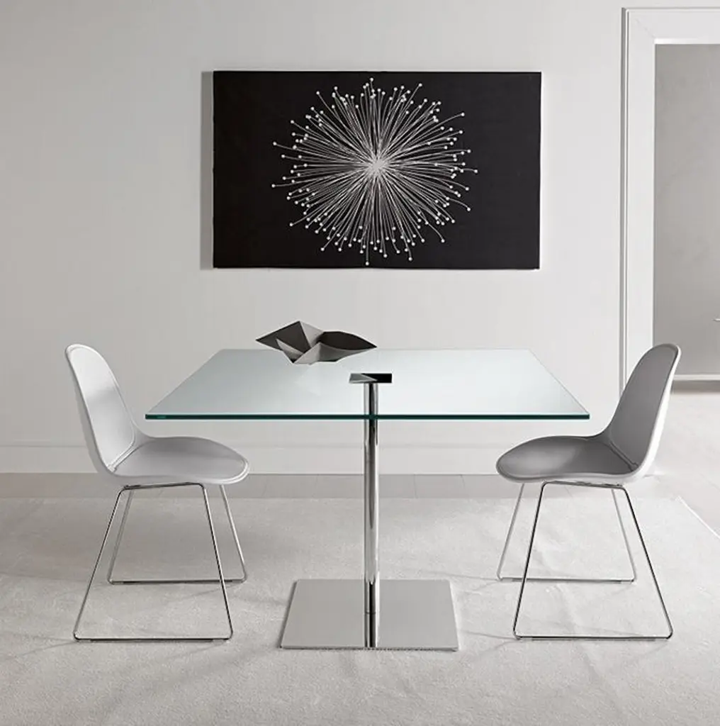 Conceived by architect and designer Giovanni Tommaso Garattoni, the Farneinte table is made of a metal chrome base and a top in tempered glass. This designer table is available in square, round and rectangular version, with transparent, extra clear or smoked glass top. Thanks to its geometric lines and luxury finishes it renders the environment elegant, but without burdening the décor. It is perfectly suited for dining rooms, kitchens or studios.