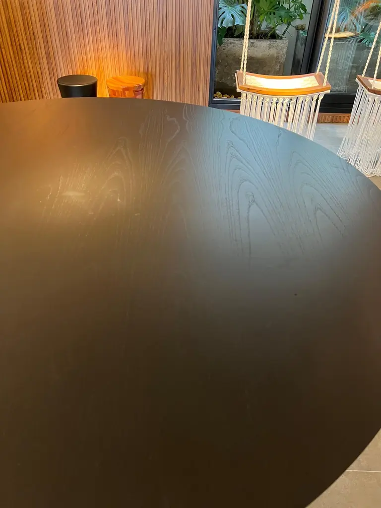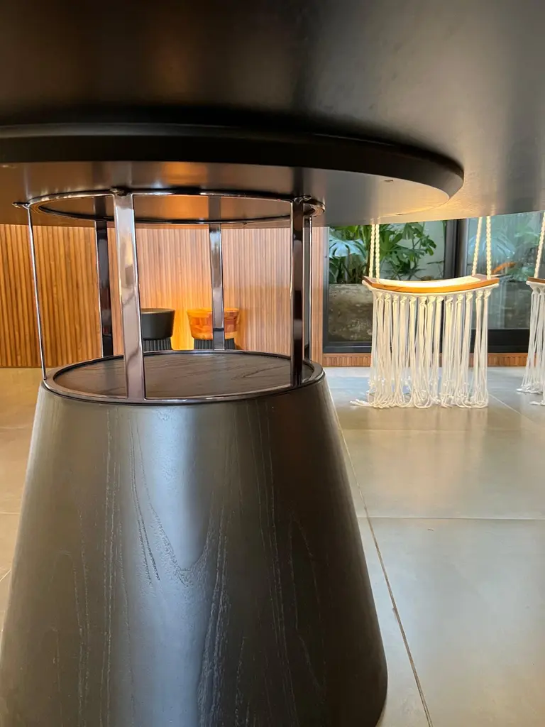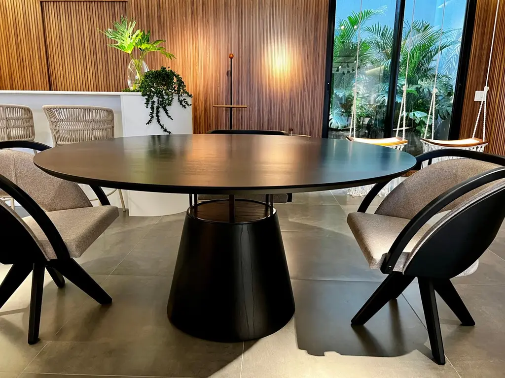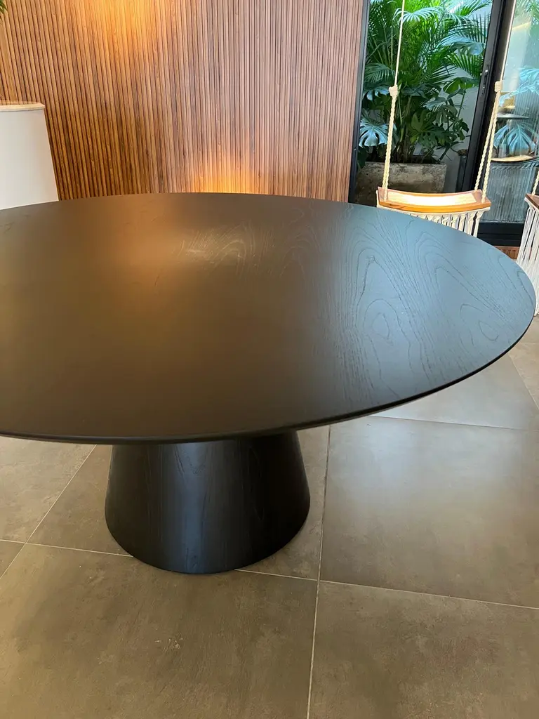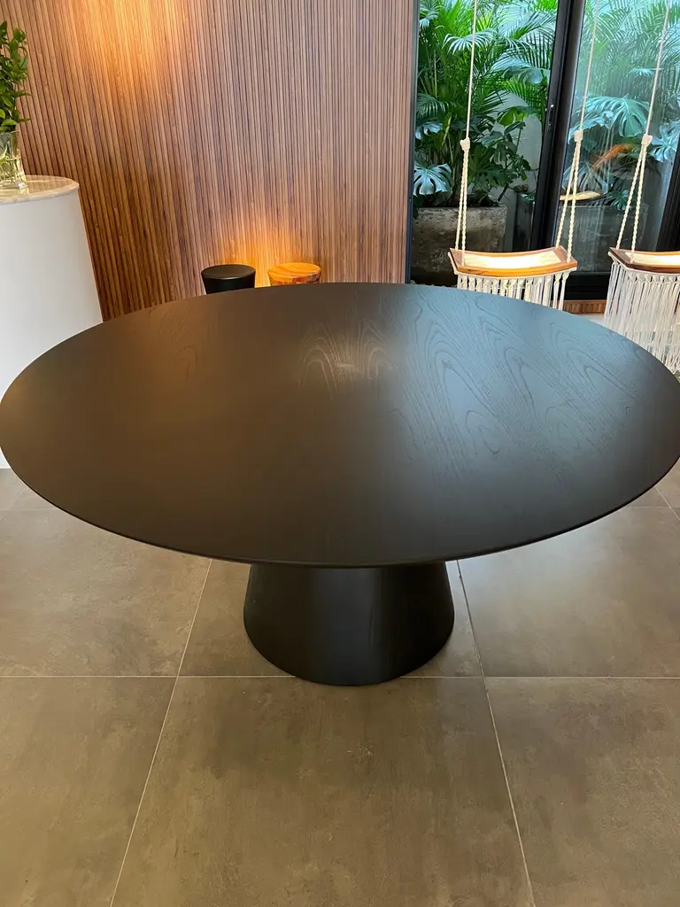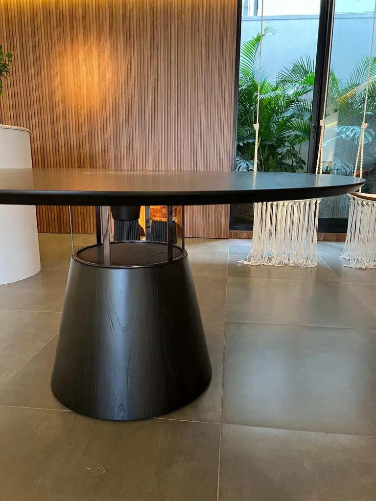Stylish contemporary design dining table.The Farol round dining table has a cone-shaped base design, made of fiberglass coated with natural wood veneer in black color. The details is in metal, carbon steel metallic onyx color.The round top is made of 25mm MDF coated with a natural wood veneer in black color. Edges are gently beveled for better table top comfort.The wood color can be personalized in natural wood or black.The Farol collection of dining tables has other sizes of tops. The collection also has side tables. Request additional information and price quotation;The dining table comes in disassembled packaging, and comes in two separate volumes. ( Easy to assemble with a screwdriver. Accompany the screws)The photo and video with chairs are for illustrative purposes only.
