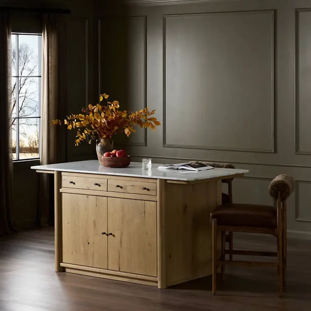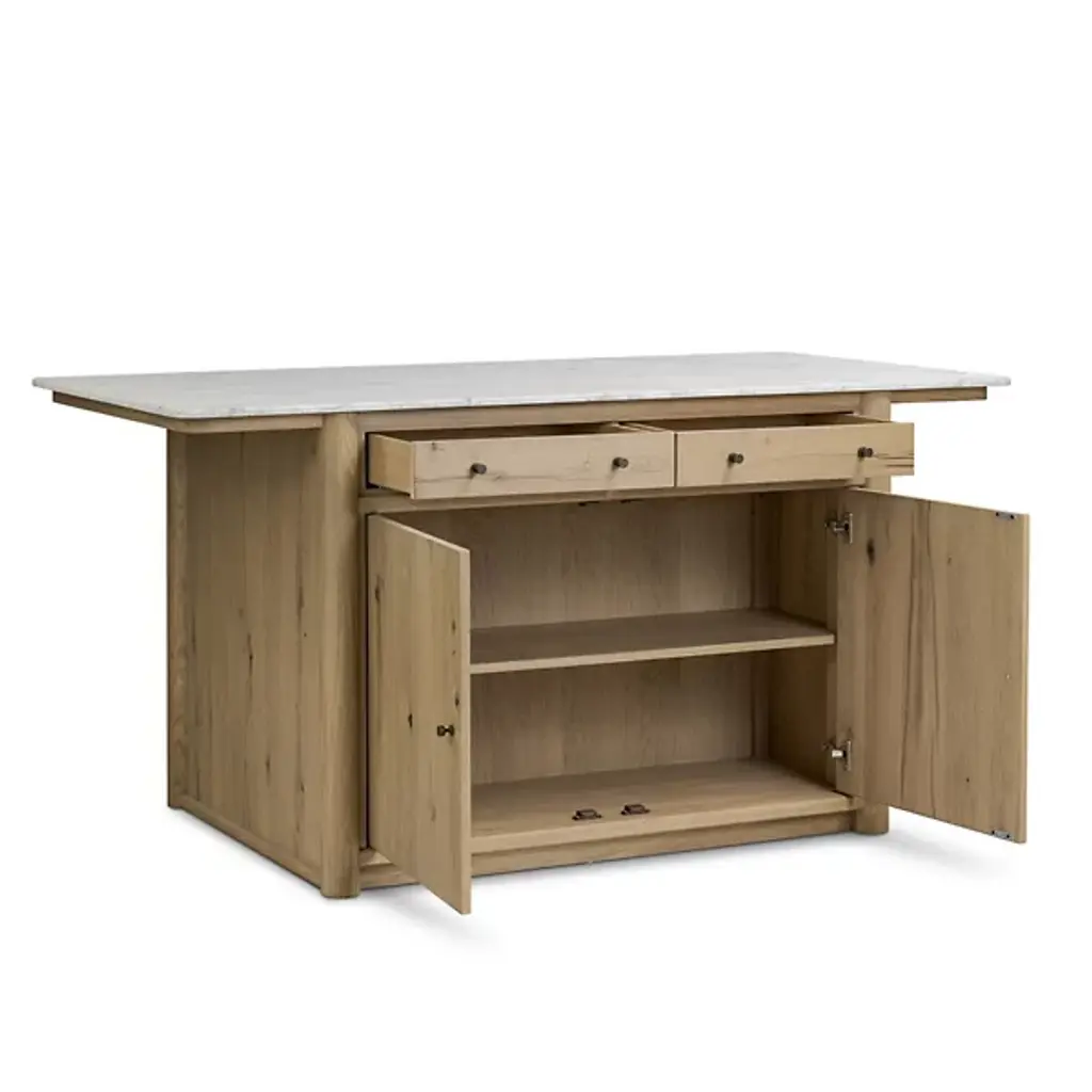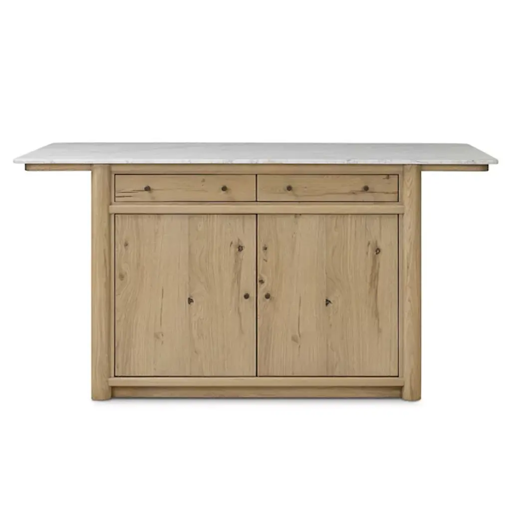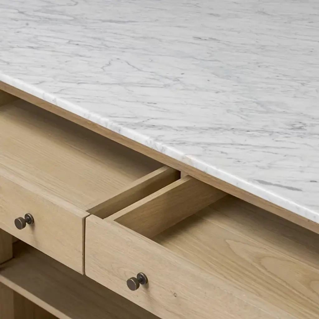 The Fatima Dining / Kitchen Table from Four Hands brings professional kitchen convenience home with its integrated storage design. This multipurpose marvel combines Carrara marble's natural beauty with oak's enduring appeal. Two top drawers and lower cabinets with adjustable shelving accommodate everything from cutlery to small appliances. The closed construction creates a built-in appearance that enhances any kitchen layout. Built to support 200 pounds, it serves as both a prep station and a natural gathering spot while cooking or entertaining with family and friends.