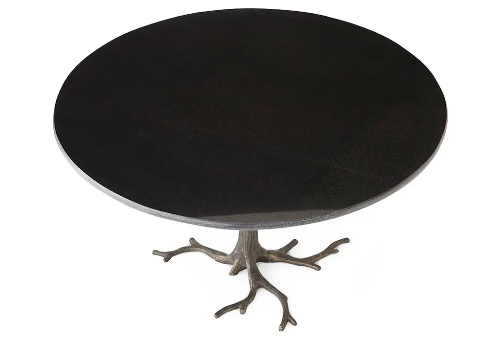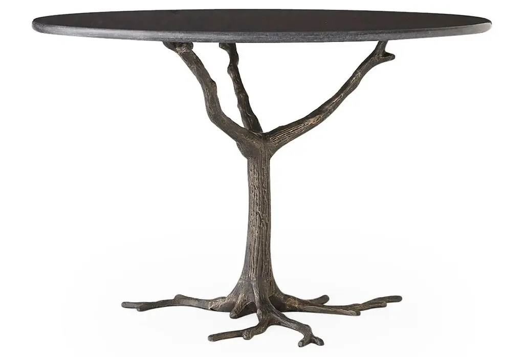This dining table makes an immediate impression thanks to its faux bois iron base and dramatic black granite top. This table comfortably seats four.