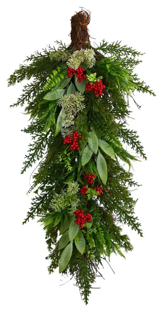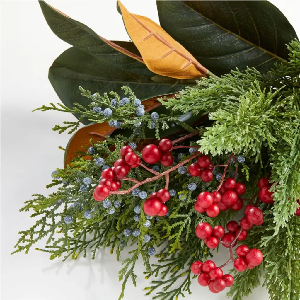 This festive bunch of faux botanicals heralds the holiday season with clusters of red berries, feathery cypress sprays, glossy holly leaves and juniper sprigs accented with blue-grey berries. For an easy accent, pop the bundle in a vase and place on the fireplace mantel, banquet or dining room table. Our cypress and berry leaf brunch is a Crate and Barrel exclusive.