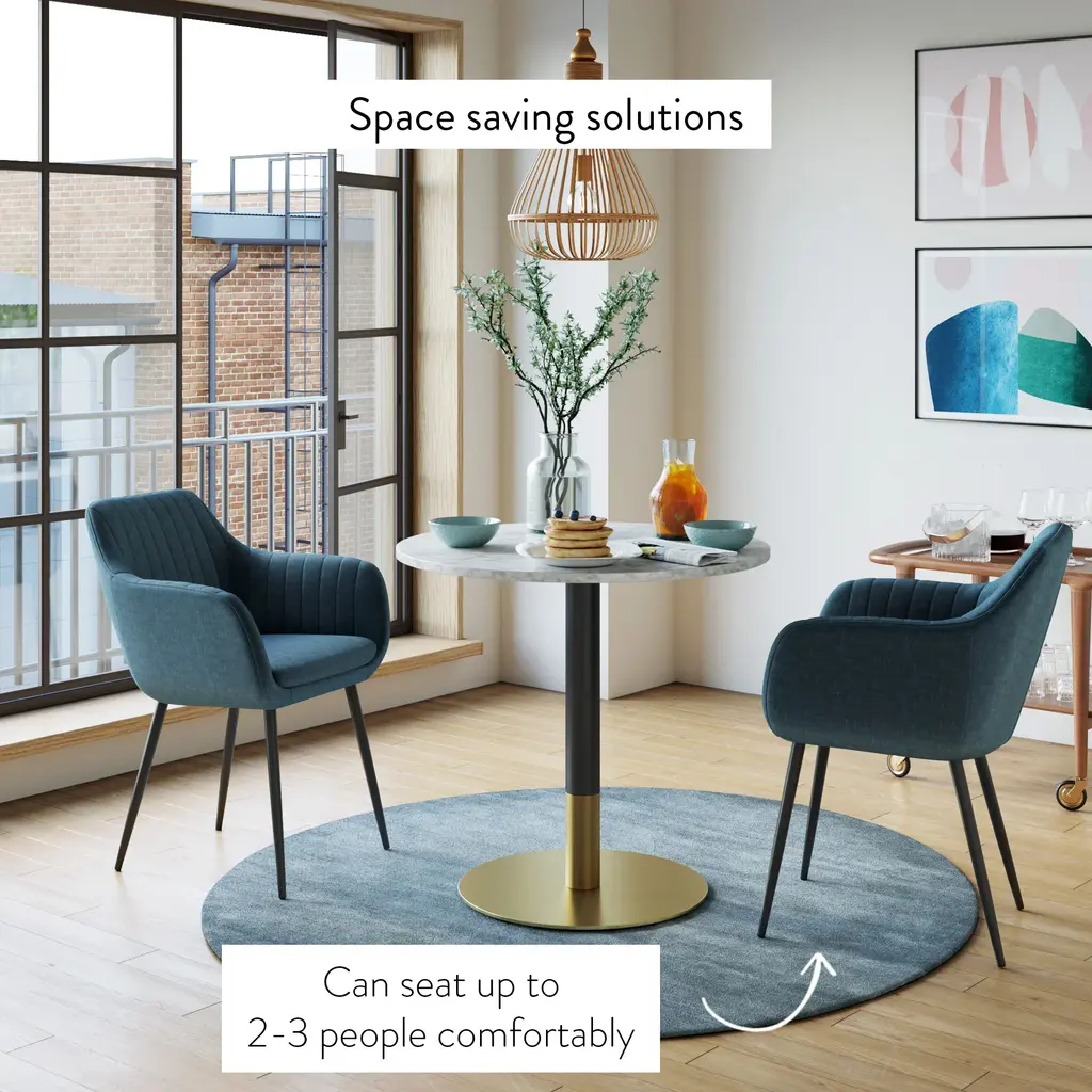 Designed for small dining areas to make you feel like you're in a Paris cafe. This anti-scratch faux carrara marble table is the perfect fit for a party of two, but if your game of Monopoly breaks loose, feel free to pull up another two seats. The table base is equipped with a weight in the base making the dreaded wobble table a thing of the past. Style with a fresh basket of croissants and freshly squeezed juice for the ultimate experience.