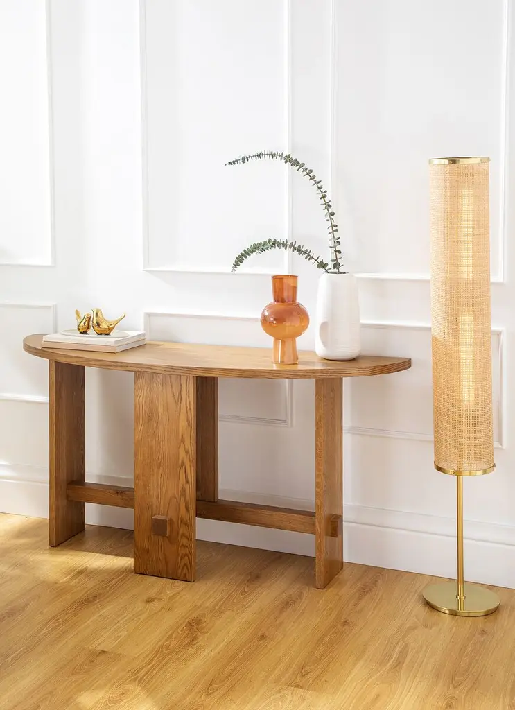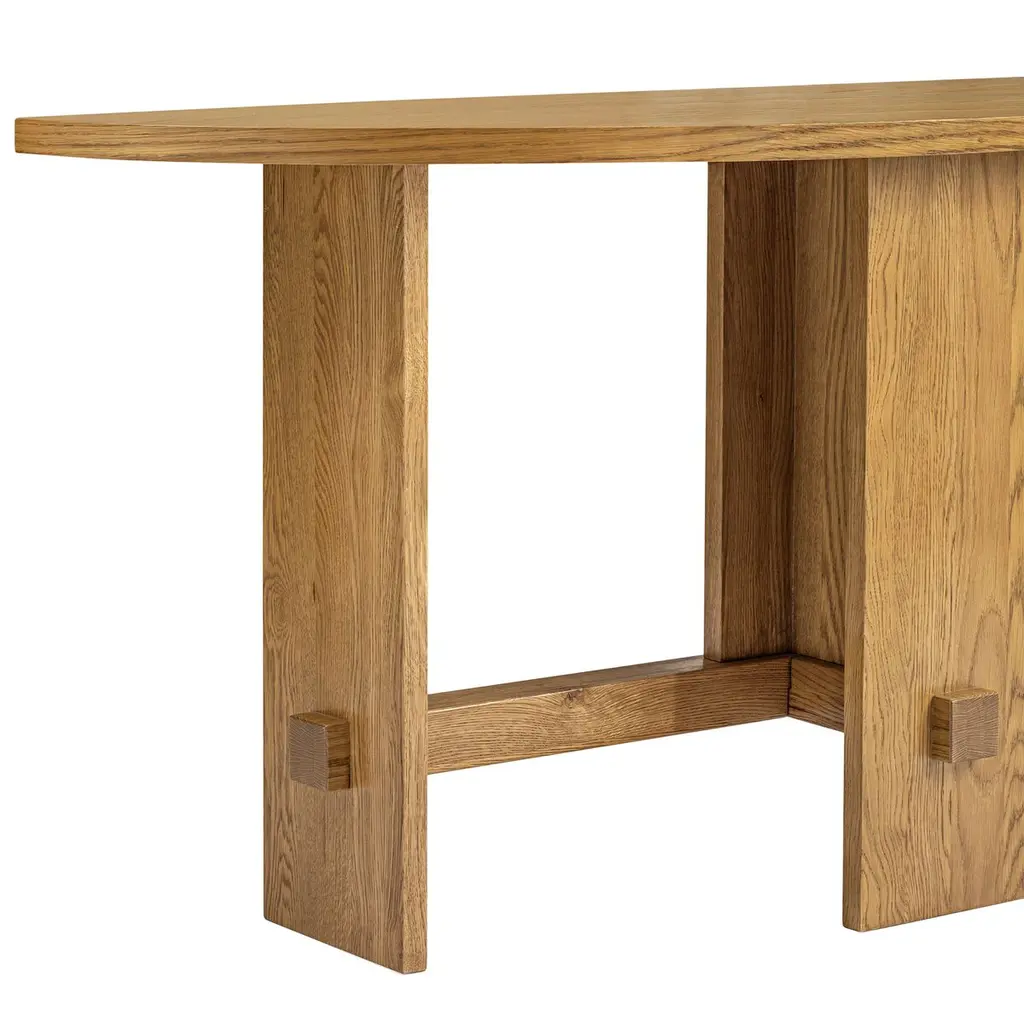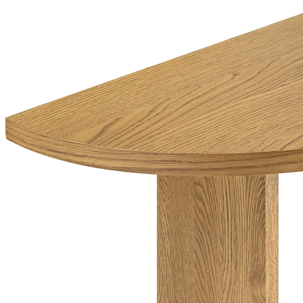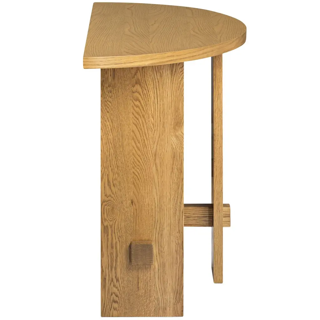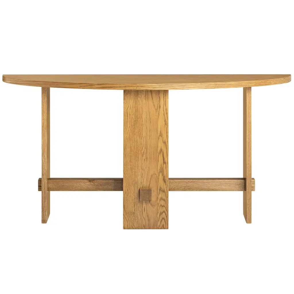The Federico Demi-Lune Console Table – a graceful addition to your space. Finished in a warm honey oak, this console table seamlessly combines style and functionality. Its distinctive demi-lune shape and quality craftsmanship make it a charming accent for entryways, hallways, or living areas. Matching sideboard and dining table also available.