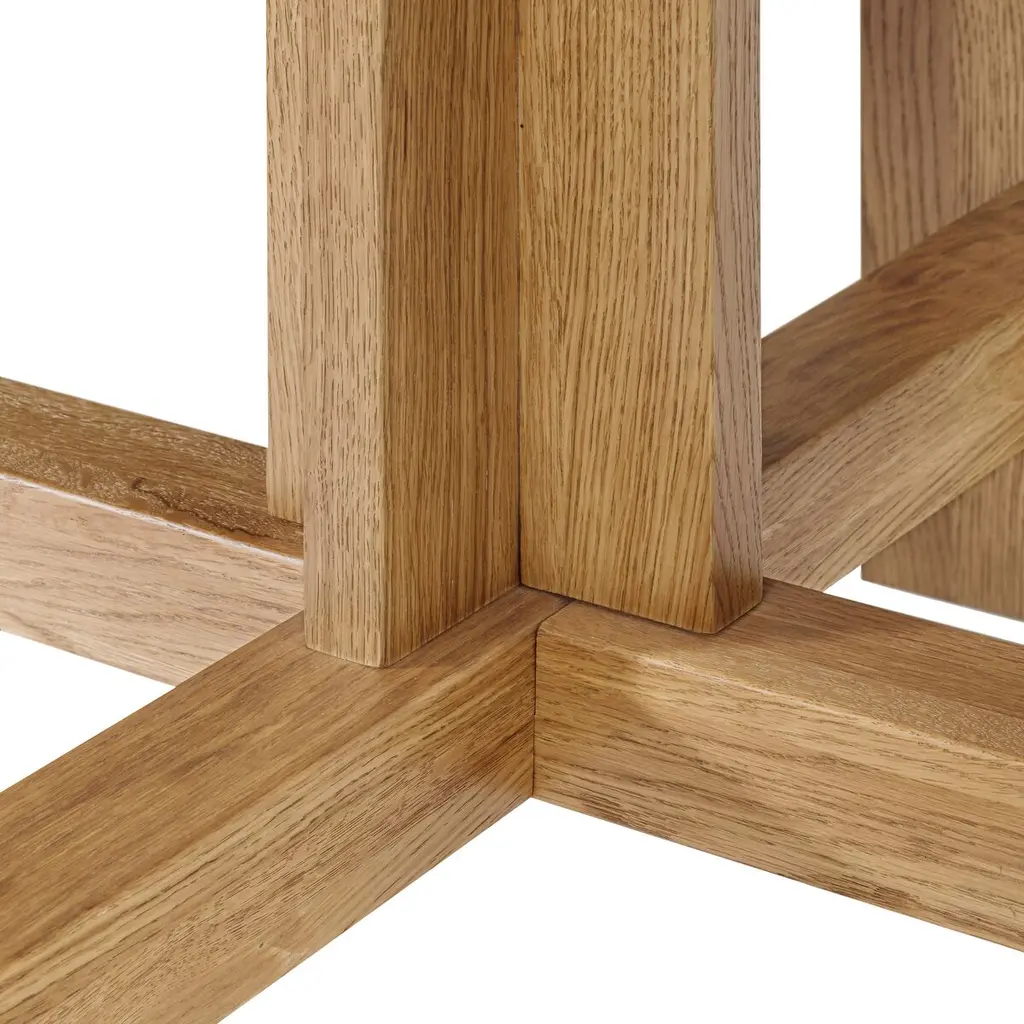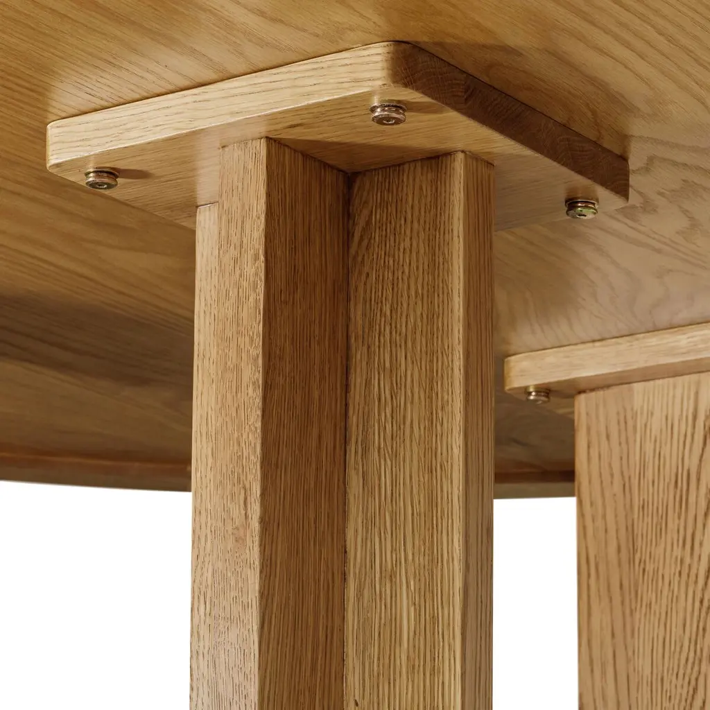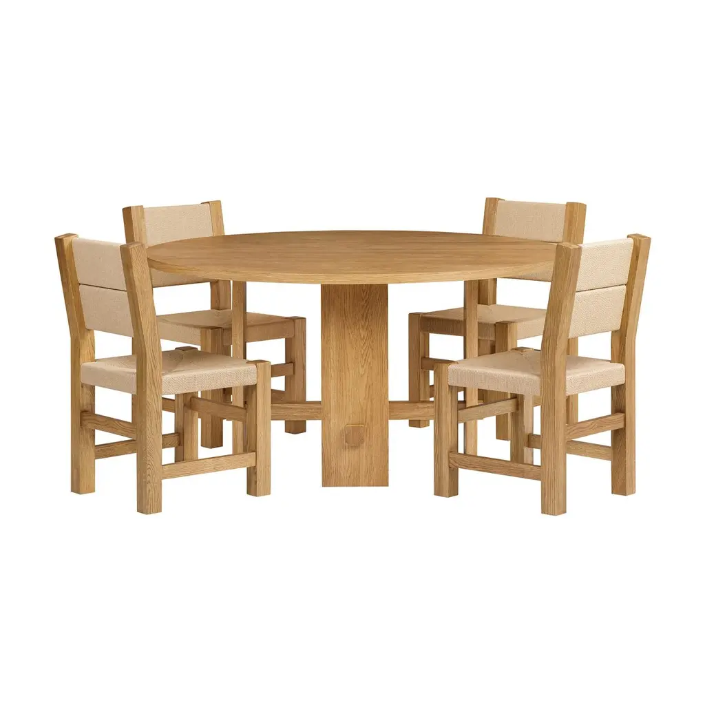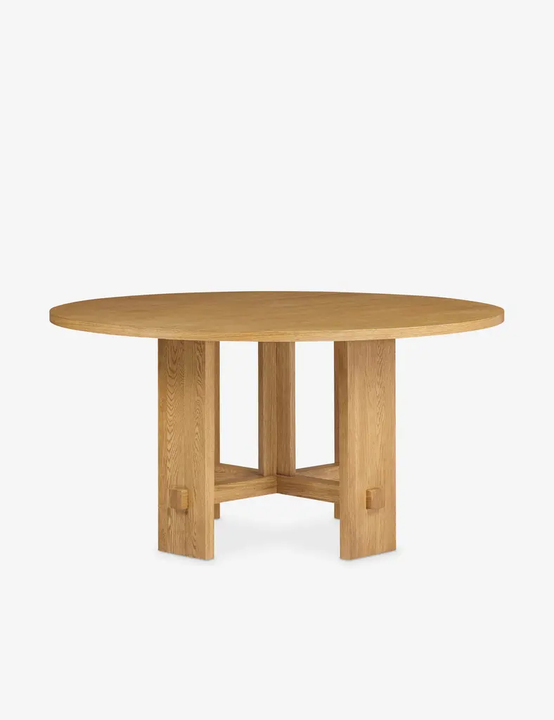Oak is prized not only for its durability and resistance to scratches but also for its eye-catching grain. This dining table's smooth surfaces and planked legs show off the wood's beauty to stellar effect, as does the hand-applied finish. Five feet in diameter, the table seats six people.