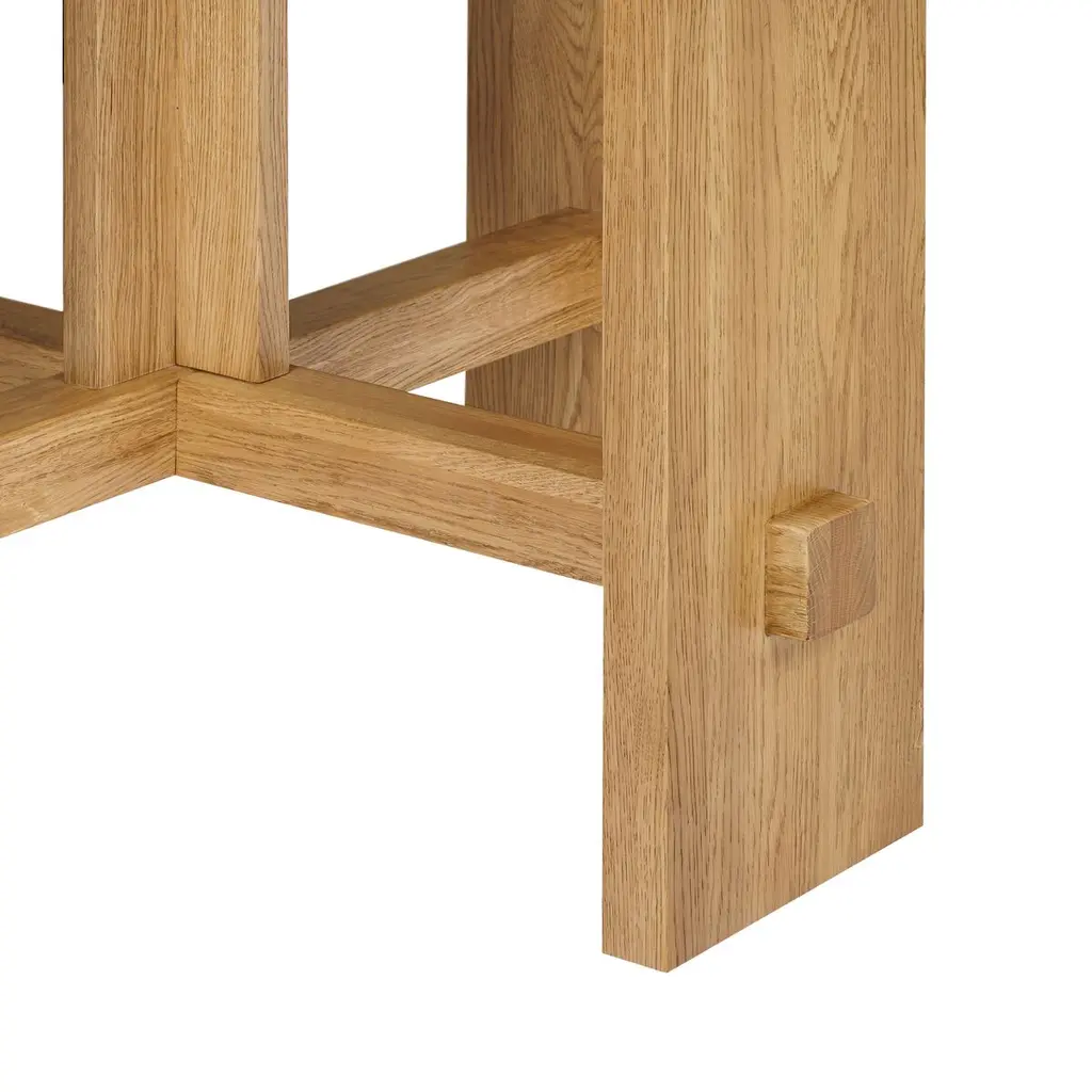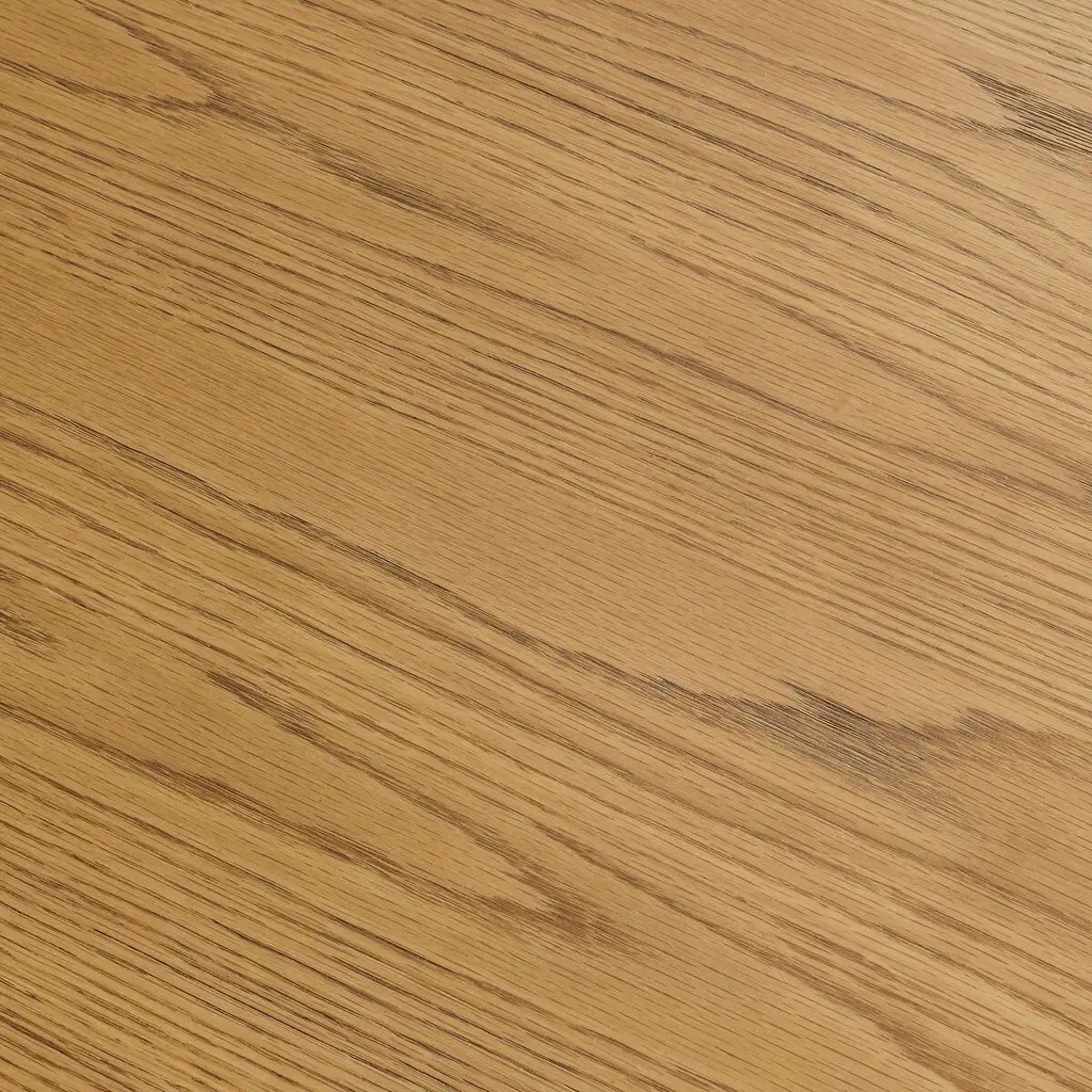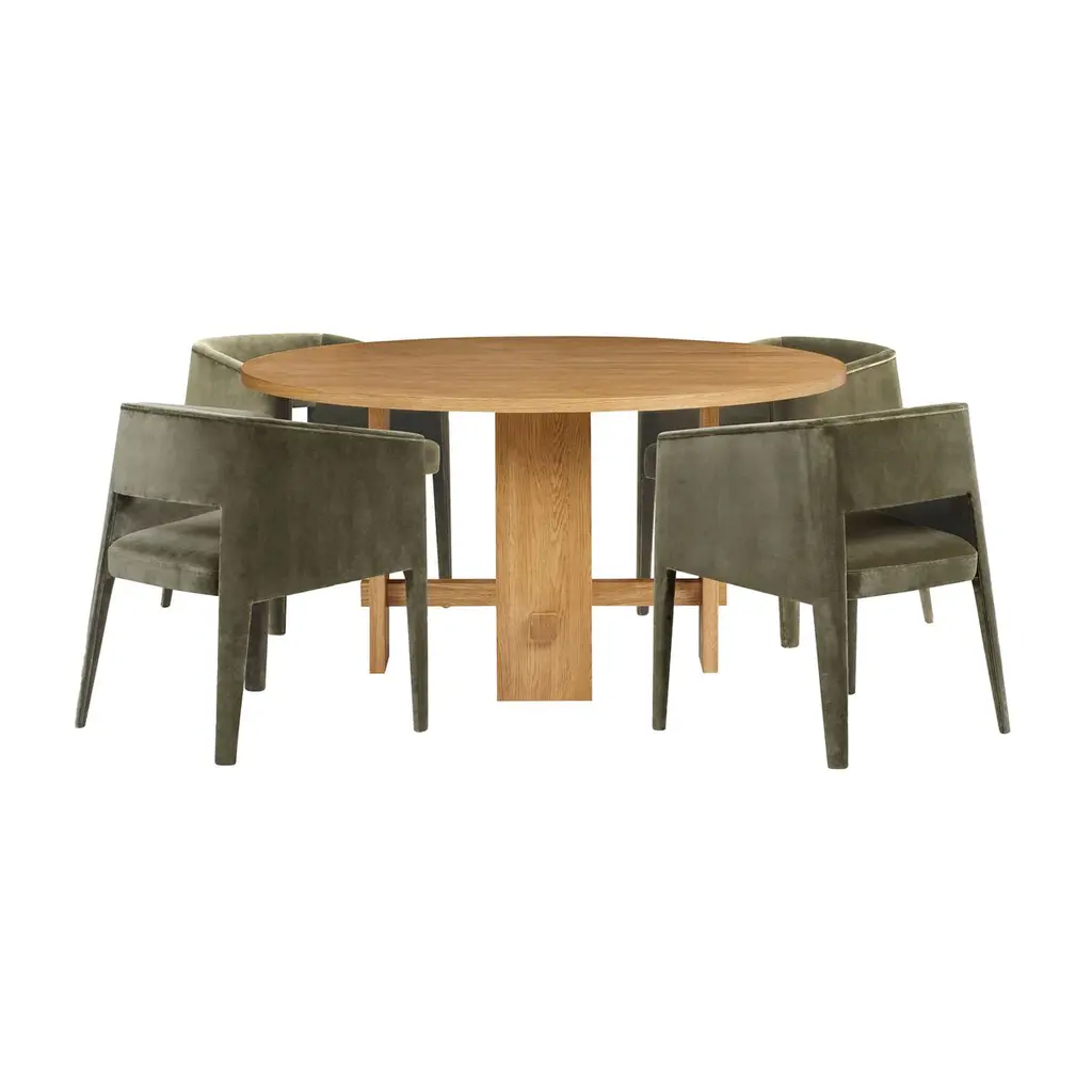 Oak is prized not only for its durability and resistance to scratches but also for its eye-catching grain. This dining table's smooth surfaces and planked legs show off the wood's beauty to stellar effect, as does the hand-applied finish. Five feet in diameter, the table seats six people.