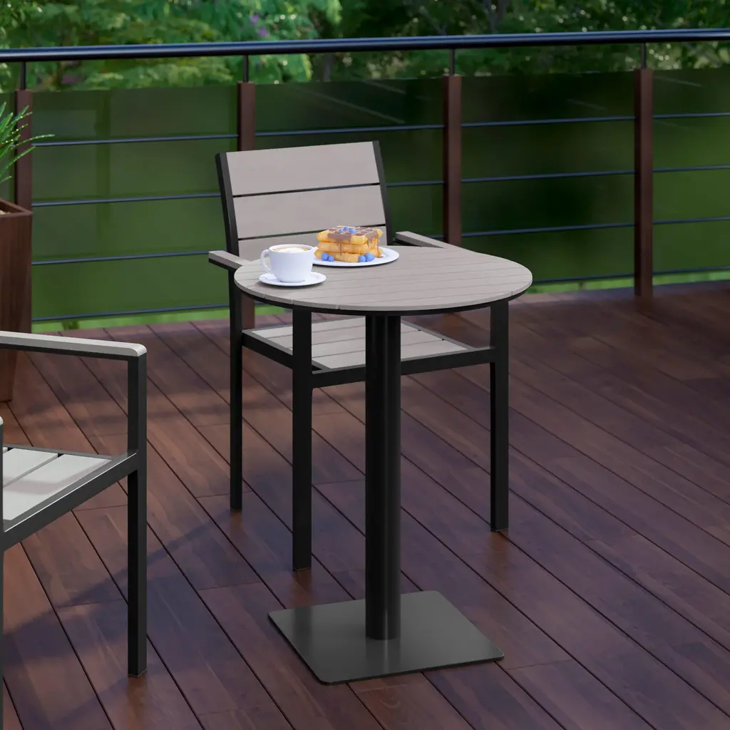 Create a first-rate dining experience at your restaurant or in the backyard with updated commercial grade dining tables. Designed for use in the hospitality industry, as well as your busy household this attractive outdoor dining table features poly resin slats that mimic the look of wood without the maintenance. UV treated to prevent fading this patio table will look great season after season. Rust resistant powder coating covers the sturdy welded metal frame capable of holding up to 300 lbs. static weight with seating for 2. The lightweight design allows for easy storage and nightly cleanup. Use this table in your kitchen or dining room without worry, the fixed floor glides will protect your indoor flooring. Assembly takes less than 10 minutes and this dining table wipes clean with a damp cloth for quick seating turnaround.