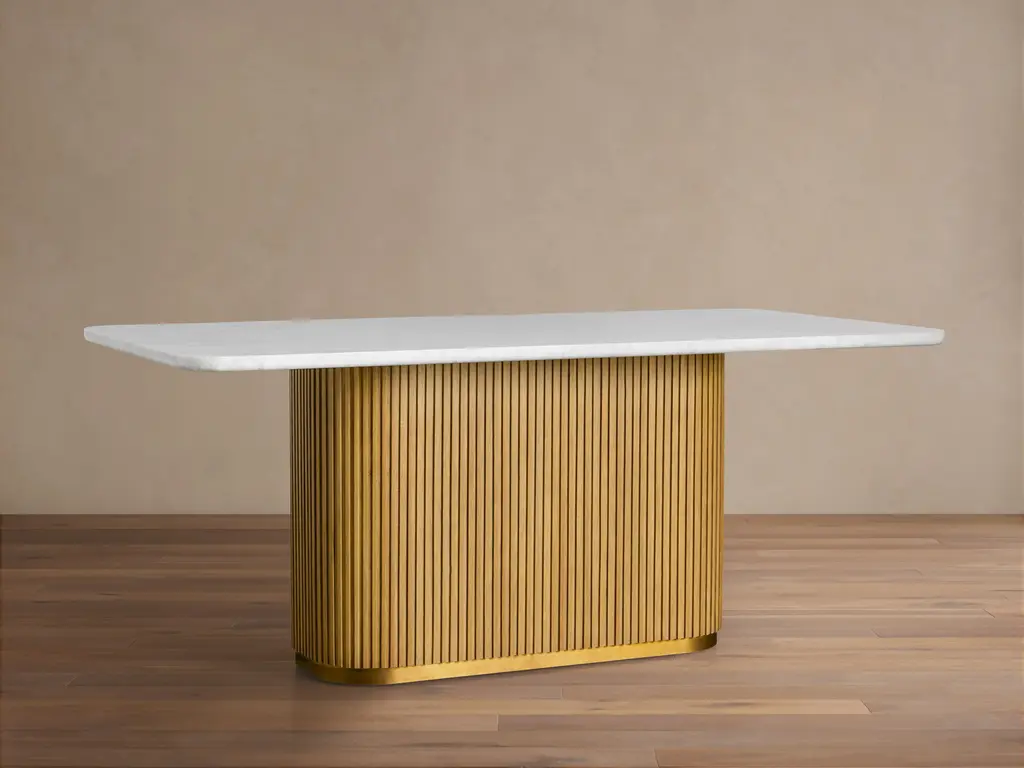 Our Finnley Collection showcases a stunning mixed-material design, inviting elevated style into any room in your home. Hand-finished pine from Finland is luxuriously complemented by a stone top, accented by light brass plinth bases and reeded oak detailing. The result is an eclectic-yet-chic collection that easily fits into any aesthetic.
