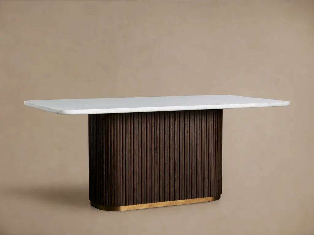 Our Finnley Collection showcases a stunning mixed-material design, inviting elevated style into any room in your home. Hand-finished pine from Finland is luxuriously complemented by a stone top, accented by light brass plinth bases and reeded oak detailing. The result is an eclectic-yet-chic collection that easily fits into any aesthetic.