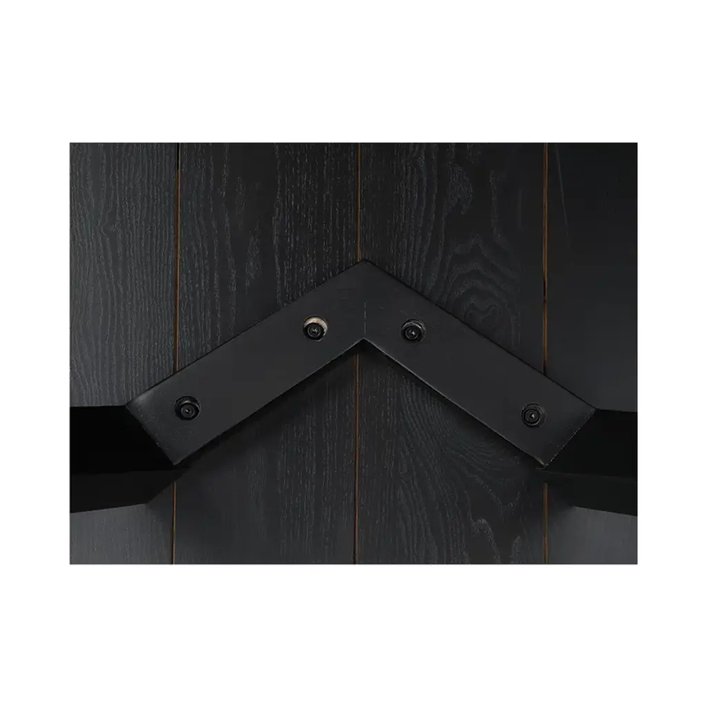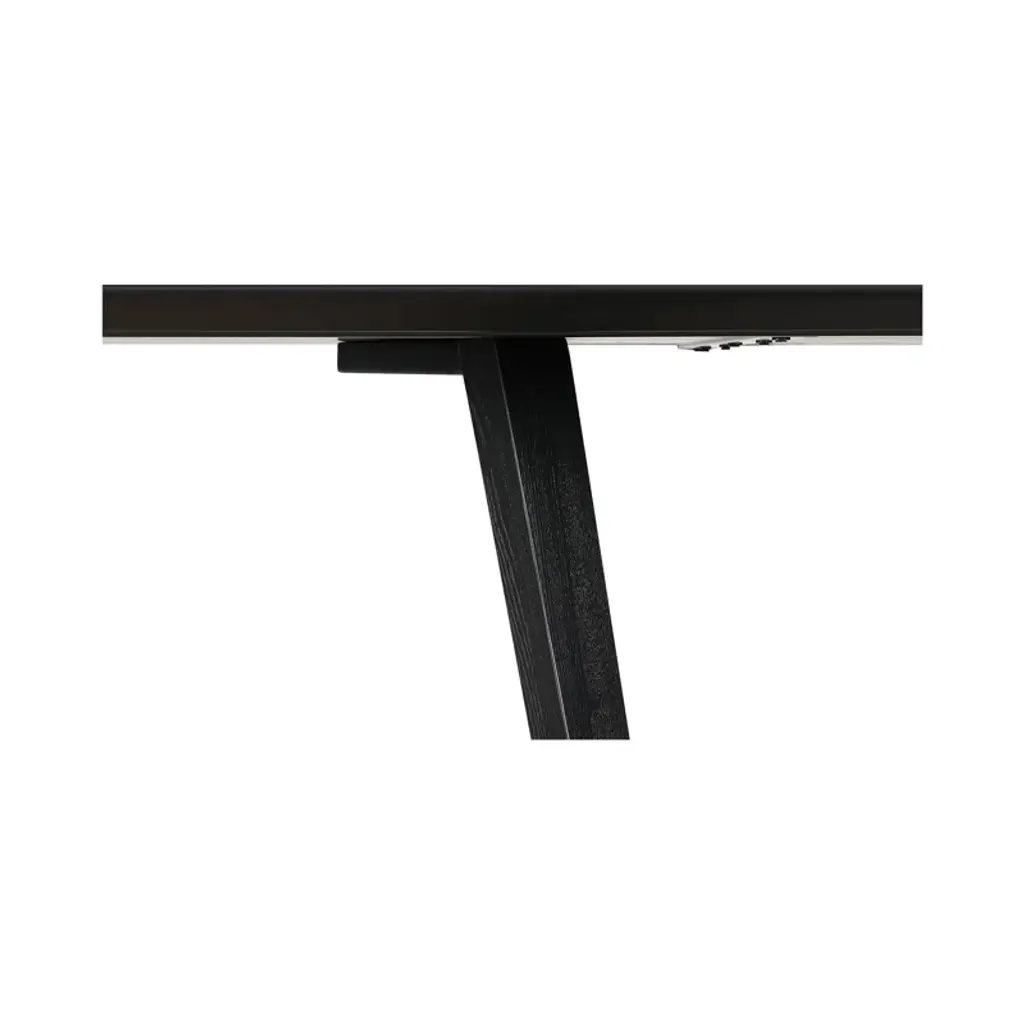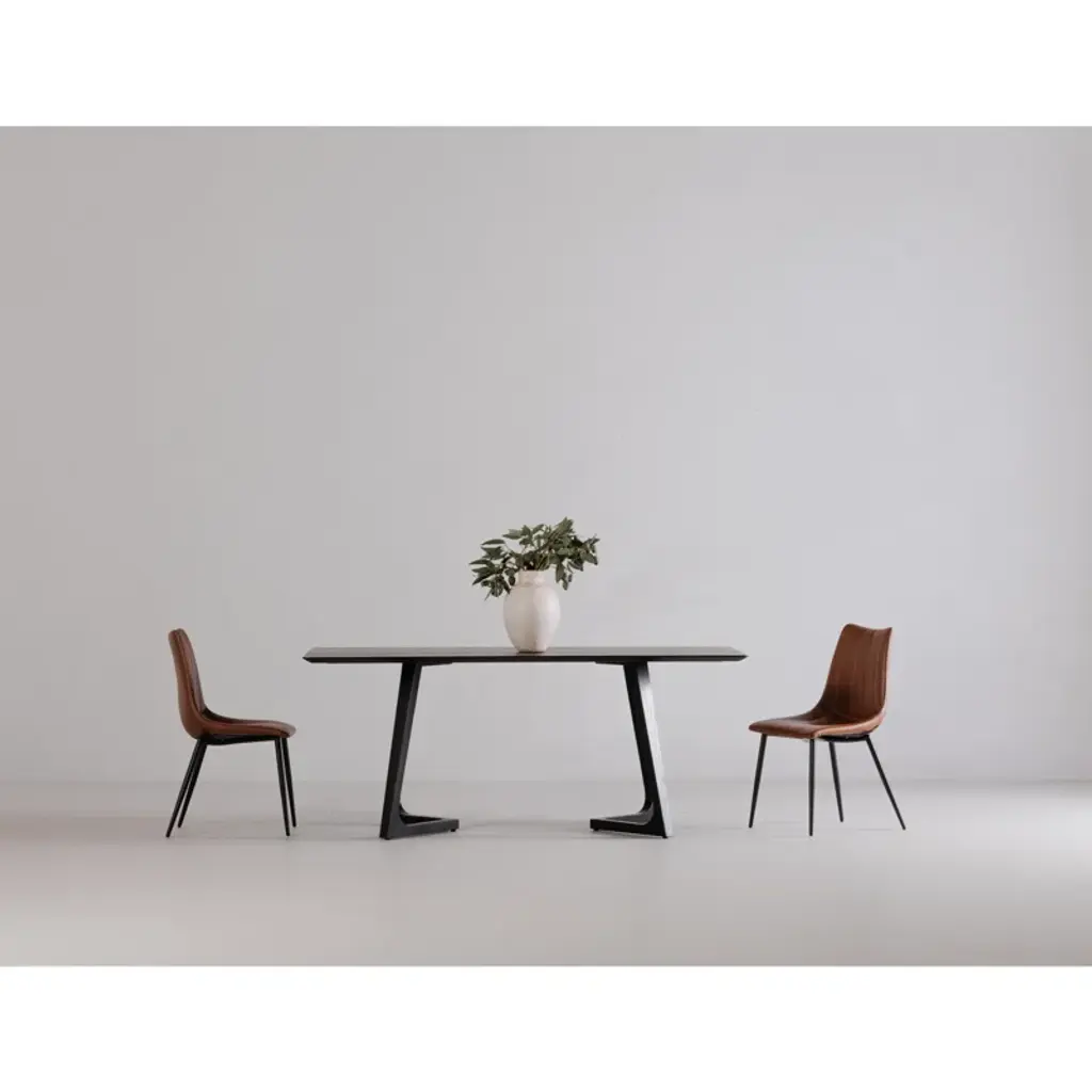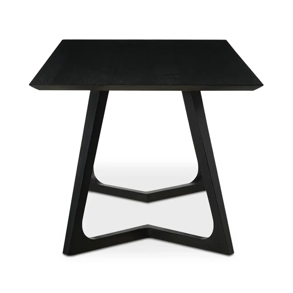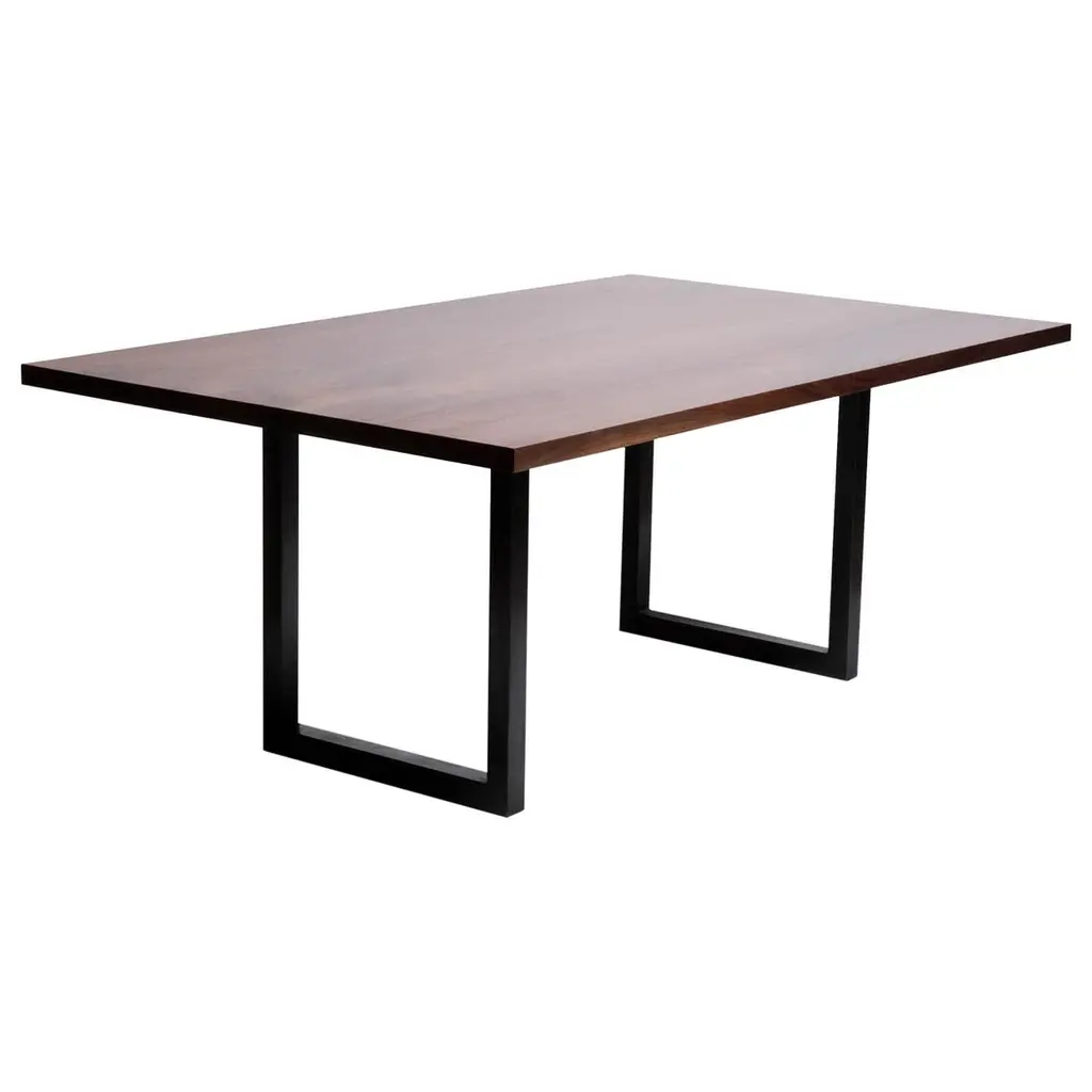 Mid-century minimalism. This sculptural dining table’s beveled top rests on sharply angular sled legs. It’s built from solid wood in a rich finish that highlights its natural grain variation, adding an organic element. With seating for up to eight, it’s ready for dinner parties + pizza nights.