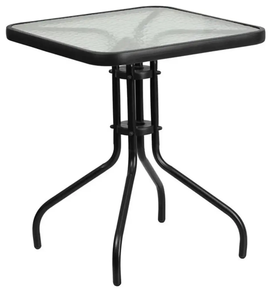 Whether adding some much needed real estate to hold drinks and snacks on the patio at home or a place for patrons to relax, have a meal and great conversation, this tempered glass and metal table can help create the perfect relaxing or entertainment environment. The ripple designed table top features a smooth surface for keeping items level. Enjoy dining outdoors year-round on this bistro patio table designed for all-weather use making it a great option for indoor and outdoor settings. For longevity, care should be taken to protect from long periods of wet weather. The powder coat finish lends the square-shaped table a bold, versatile appearance that matches well with your favorite chairs. This glass table will enhance the look of your bistro, cafe, restaurant, hotel or home patio space.Features:Finish: Black Powder CoatSquare Patio Table for Restaurants, Banquet Halls and Dining RoomSeating for 2 peopleSmooth Clear Tempered Glass Surface5mm Thick GlassBlack Powder Coat Frame Finish with Protective Floor GlidesDesigned for Commercial and Residential UseOutdoor dining table for sunroom, balcony, deck, patio or poolsideSpecifications:Product Dimensions: 28" H x 23.5" W x 23.5" DProduct Weight: 17 lbsTop Dimensions: 1.5" H x 23.5" W x 23.5" DProduct Dimensions: (Base) 19" W