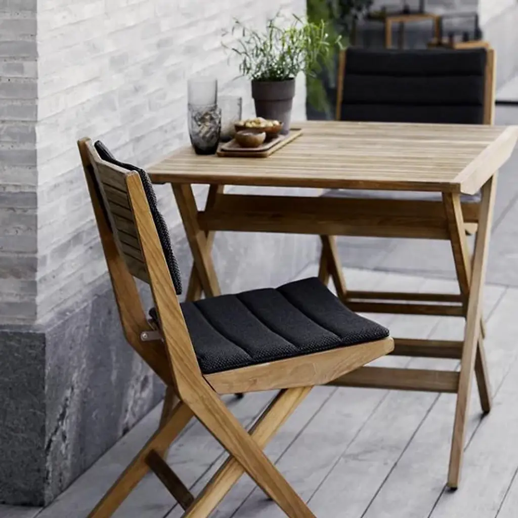 Clean, compact, classic. When the warm sun comes rolling by, call on the tried and true design of the Flip Flip Folding Square Outdoor Dining Table from Cane-line for a relaxed dining experience. The table shows the beauty and versatility in simplicity. A crossing frame and a linear tabletop create an inviting, airy feel when dining. The clean lines of the table amplify the traditional craftsmanship and the richness of the teak wood. Teak’s density and oils make it easy to maintain after long periods outdoors. To clear up space in your patio, the table collapses easily into a tight form that’s prime for storage.