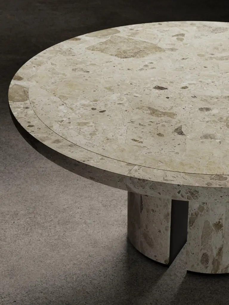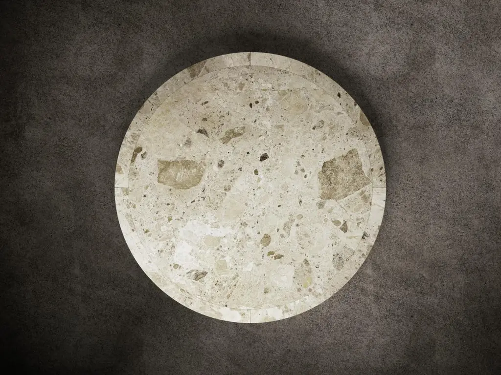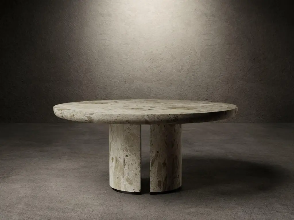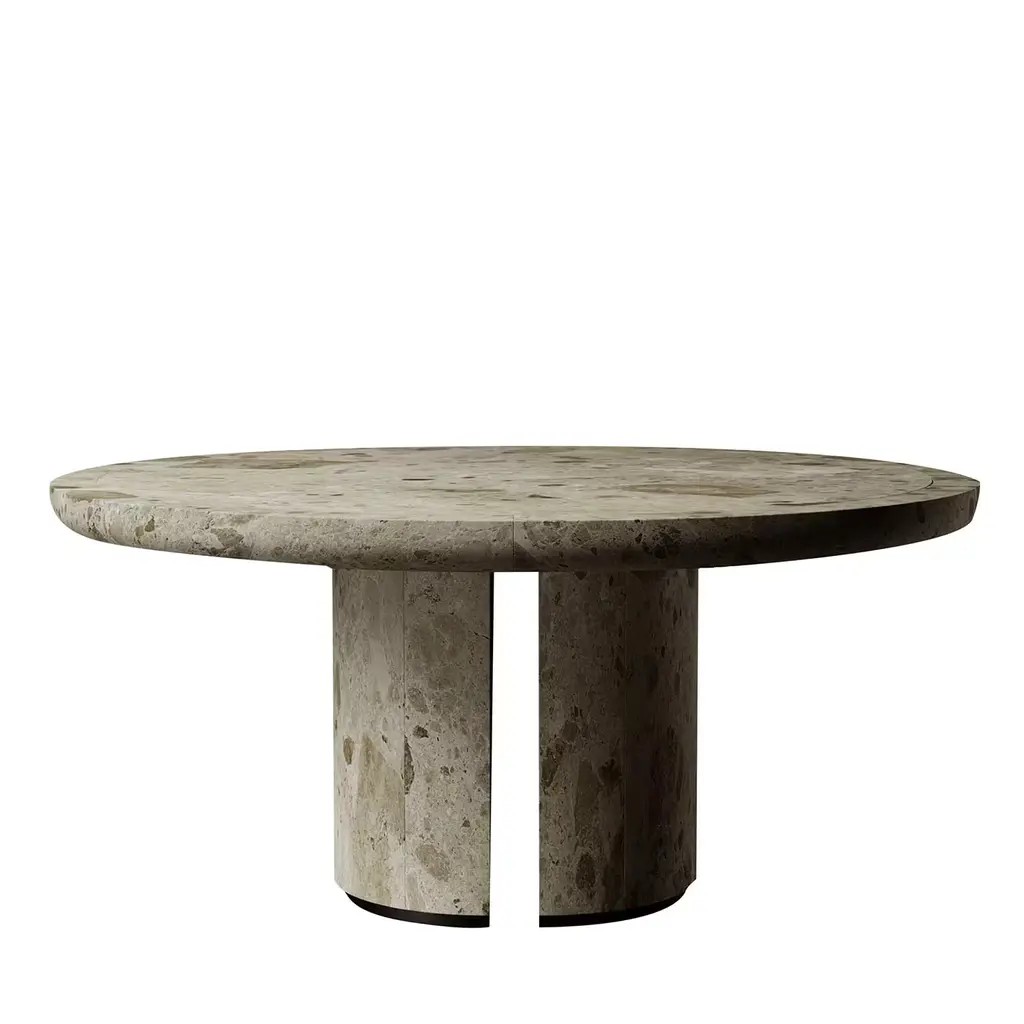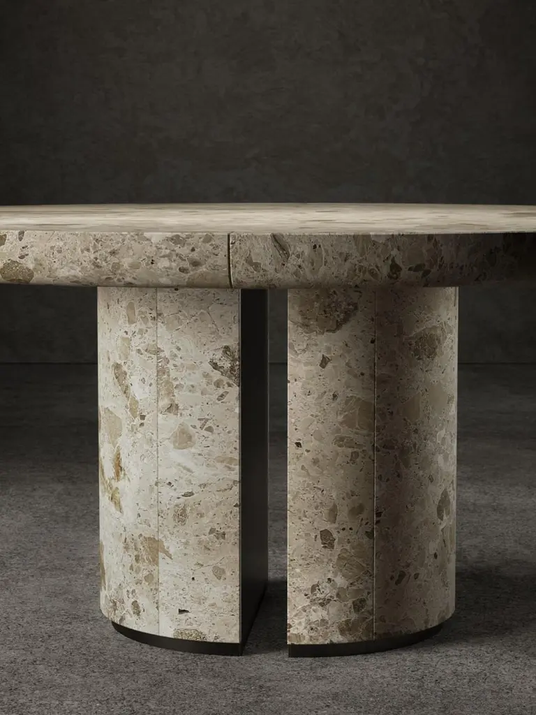 For No One dining table has a top made up of a supported Ambrosia matt marble slab with an 8 cm frame in solid marble.The top is anchored to the two bases by matt black metal plates. Each base is made up of two half-cylinders in matt-finishing Ambrosia marble on the outside and matt black metal on the inside and in the plinth. For No One dining table is available in this material combination only.DIMENSIONS:ROUND_ ø160xH74 cm LARGE_ L290xW120xH74 cm