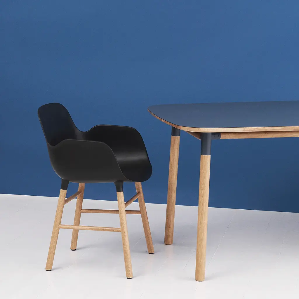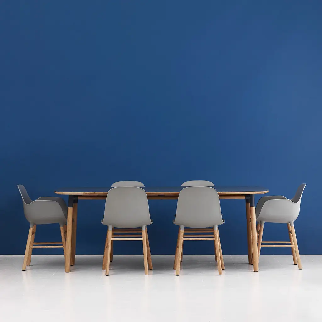 The rectangular version of Form Table offers a spacious dining option in the Danish collection’s signature pared-down style. Simon Legald’s design springs from the same uniquely cupped joints at the table legs as seen in the companion seating. Crafted in solid oak with a matte linoleum surface, the table is durable and easily maintained while its rounded edges and clean lines are a bold testament to functional simplicity at its best.