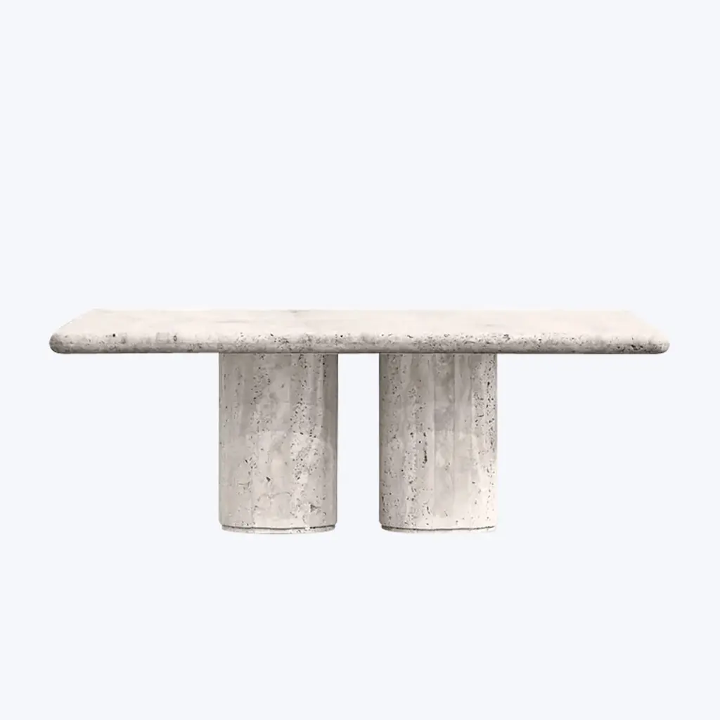 SIMPLISTIC YET MUSCULAR FORMS INFLUENCED BY POST MODERN ITALIAN DESIGN.DIMENSIONS: 96”L x 42”W x 30”H: - 1.5" THICK TABLE TOP- 14”Ø SOLID BASE(S) WITH 1.5" THICK LEDGE ON TOP WITH3/4" EXTRA HEIGHT ON BASE FOR INTERLOCK- 6”Ø x 3/4"H CUTOUT(S) ON UNDERSIDE OF TABLE TOPCONSTRUCTION:TABLE TOP: - 3/4”x 2 SLABS WITH 3/4” EASED EDGE & 20° TAPER TO REMAINING 3/4” ON UNDERSIDE OF TABLE TOP- HOLE IN TABLE TOP INTERLOCKS WITH BASE OF TABLEBASE:- CARVED FROM A SINGLE SOLID BLOCK OF STONE- FELT LINING TO BOTTOM OF BASE FOR FLOOR PROTECTIONWEIGHT:96”L x 42”W x 30”H: - GROSS WEIGHT INCLUDING WOOD CRATE 302LBS