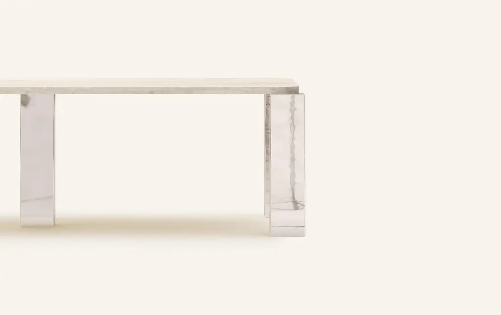 MONOLITHIC FORMS SOFTENED BY GENTLE EDGES. WITH ITS BOLD MARBLE PATTERNS CUBO IS AS VERSATILE AS IT IS STRIKING.DIMENSIONS:86”L x 44”W x 30”H: - 84”L x 42”W x 1.5” THICK TABLETOP WITH WITH 6" RADIUS CORNERS - 7”L x 7”W LEGS- TOP 1" OFFSET FROM LEGS - 2” CUTOUT(S) ON UNDERSIDE OF TABLE TOPCONSTRUCTION:TABLE TOP: - 3/4”x 2 SLABS WITH EASED EDGE- HOLE(S) IN TABLE TOP INTERLOCKS WITH BASE OF TABLEBASE:- HOLLOW CONSTRUCTION USING 3/4” STONE SLAB OR 304 STAINLESS STEEL- FELT LINING TO BOTTOM OF BASE FOR FLOOR PROTECTION- STONE FINISH TO TOP OF BASE ON ALL STONE VARIANTSWEIGHT:86”L x 44”W x 30”H WITH CHROME LEGS: - GROSS WEIGHT INCLUDING WOOD CRATE 798LBS