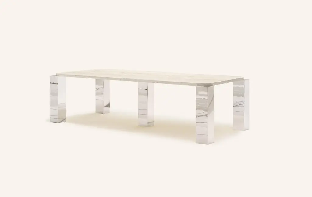 MONOLITHIC FORMS SOFTENED BY GENTLE EDGES. WITH ITS BOLD MARBLE PATTERNS CUBO IS AS VERSATILE AS IT IS STRIKING.DIMENSIONS:98”L x 44”W x 30”H: - 96”L x 42”W x 1.5” THICK TABLETOP WITH WITH 6" RADIUS CORNERS - 7”L x 7”W LEGS- TOP 1" OFFSET FROM LEGS - 2” CUTOUT(S) ON UNDERSIDE OF TABLE TOPCONSTRUCTION:TABLE TOP: - 3/4”x 2 SLABS WITH EASED EDGE- HOLE(S) IN TABLE TOP INTERLOCKS WITH BASE OF TABLEBASE:- HOLLOW CONSTRUCTION USING 3/4” STONE SLAB OR 304 STAINLESS STEEL- FELT LINING TO BOTTOM OF BASE FOR FLOOR PROTECTION- STONE FINISH TO TOP OF BASE ON ALL STONE VARIANTSWEIGHT:98”L x 44”W x 30”H WITH CHROME LEGS: - GROSS WEIGHT INCLUDING WOOD CRATE 890LBS
