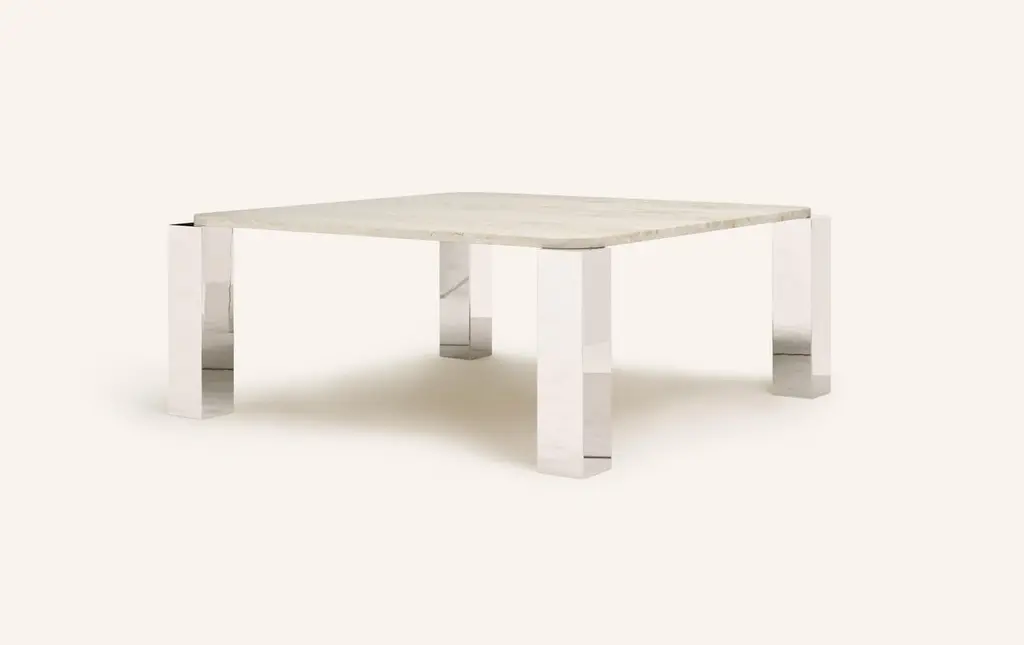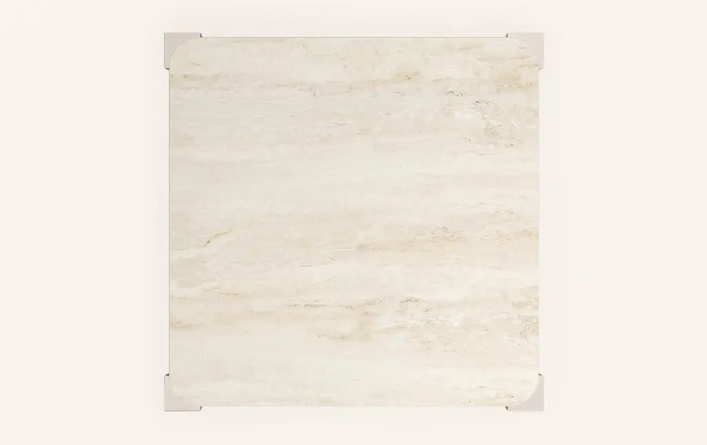 Form(la) Cubo Square Dining Table 74”l X 74”w X 30”h Travertino Navona & Chrome