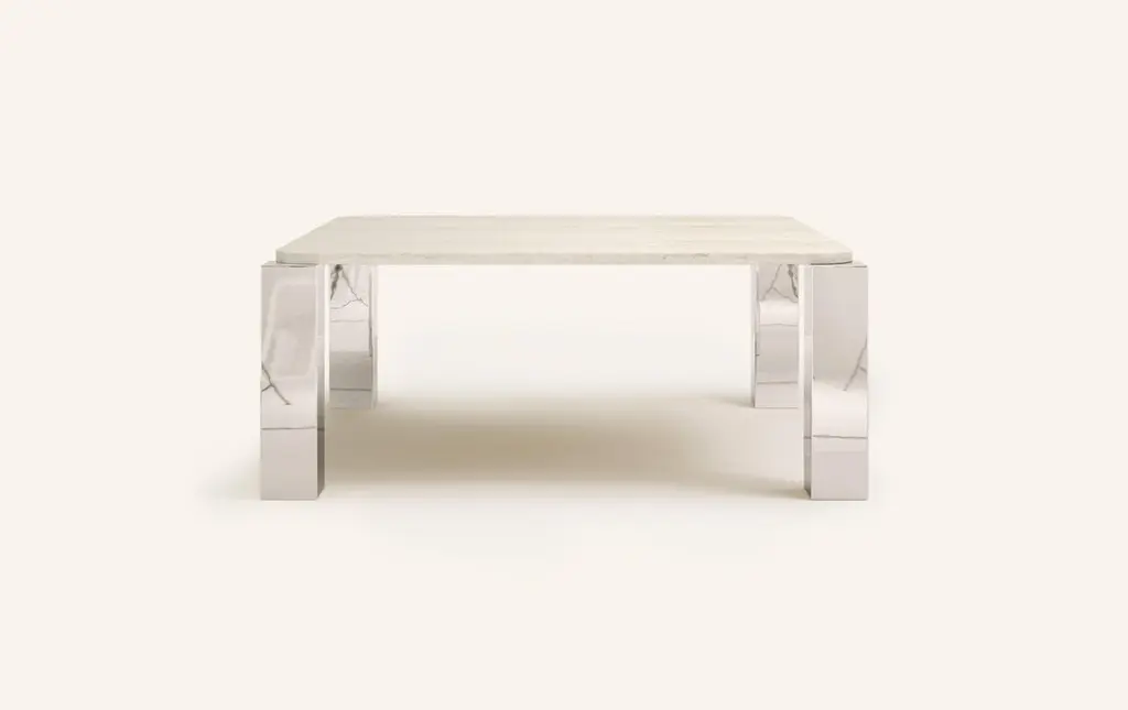 MONOLITHIC FORMS SOFTENED BY GENTLE EDGES. WITH ITS BOLD MARBLE PATTERNS CUBO IS AS VERSATILE AS IT IS STRIKING.DIMENSIONS:74”L x 74”W x 30”H: - 72”L x 72”W x 1.5” THICK TABLETOP WITH WITH 6" RADIUS CORNERS - 7”L x 7”W LEGS- TOP 1" OFFSET FROM LEGS - 2” CUTOUT(S) ON UNDERSIDE OF TABLE TOPCONSTRUCTION:TABLE TOP: - 3/4”x 2 SLABS WITH EASED EDGE- HOLE(S) IN TABLE TOP INTERLOCKS WITH BASE OF TABLEBASE:- HOLLOW CONSTRUCTION USING 3/4” STONE SLAB OR 304 STAINLESS STEEL- FELT LINING TO BOTTOM OF BASE FOR FLOOR PROTECTION- STONE FINISH TO TOP OF BASE ON ALL STONE VARIANTSWEIGHT:74”L x 74”W x 30”H WITH CHROME LEGS: - GROSS WEIGHT INCLUDING WOOD CRATE 1058LBS