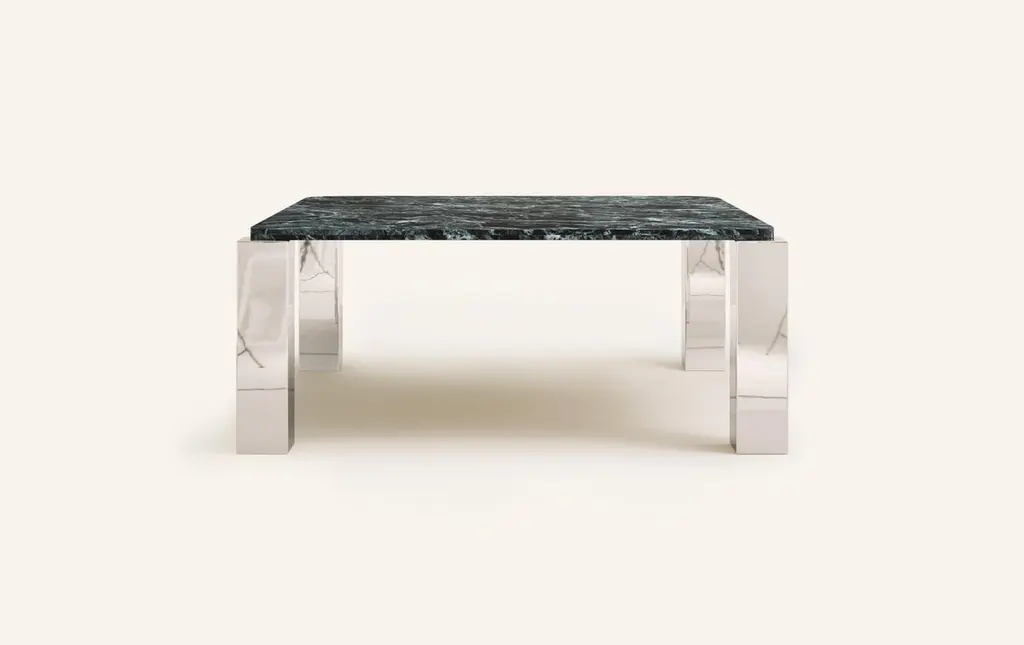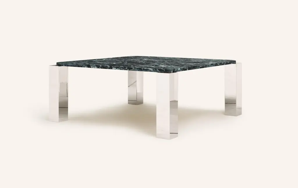 Form(la) Cubo Square Dining Table 74”l X 74”w X 30”h Verde Alpi Marble & Chrome