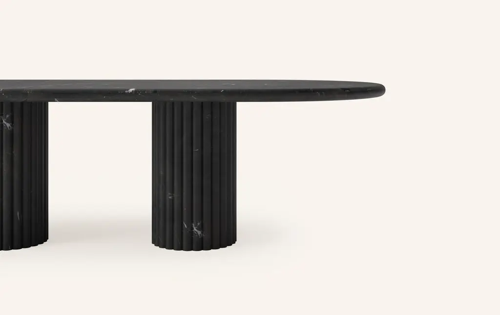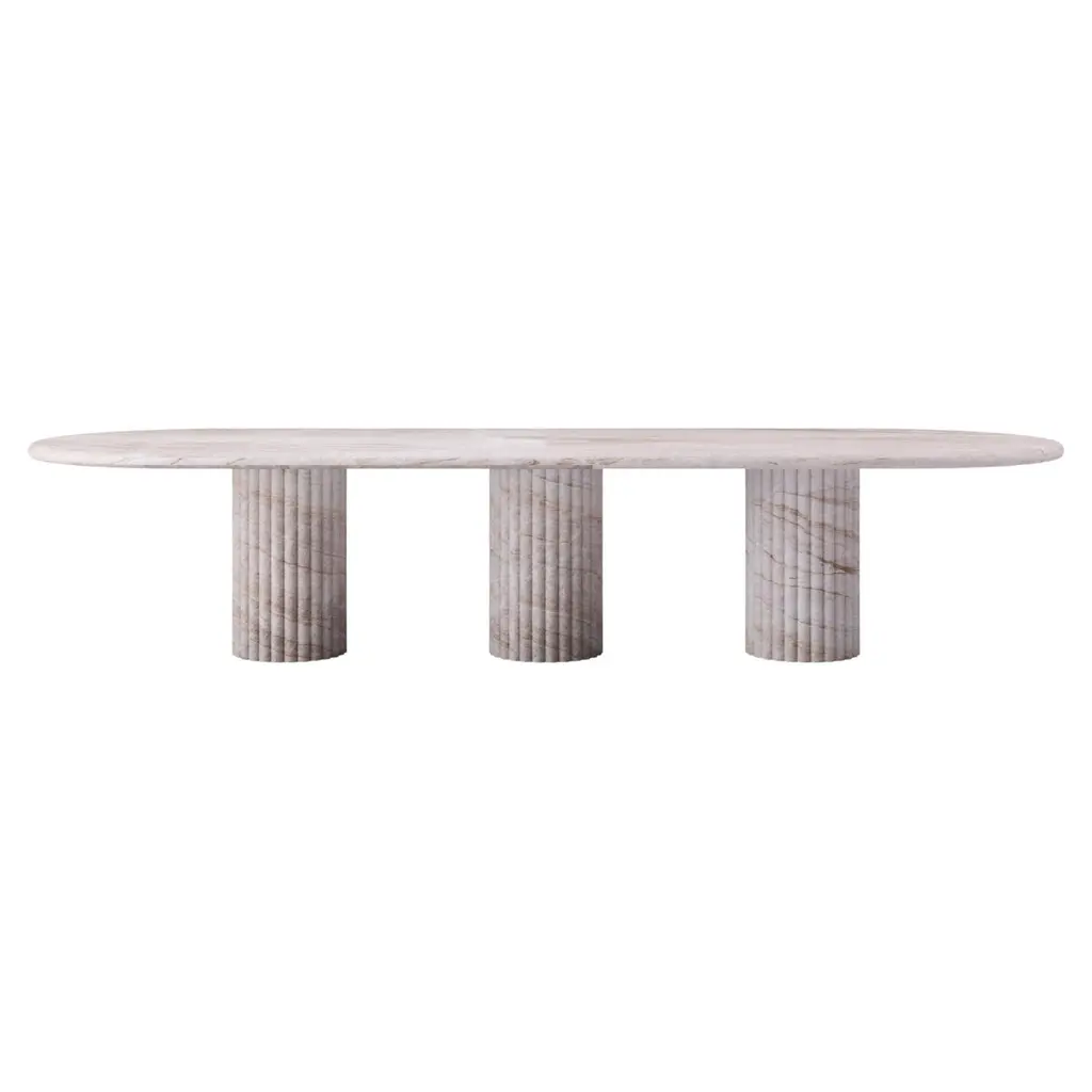OUR MOST COVETED COLLECTION AND MODERN TWIST ON AN ANCIENT ROMAN CLASSIC. RECENTLY REFRESHED WITH A MORE PLAYFUL AND ROBUST PROFILE.DIMENSIONS:144”L x 48”W x 30”H: - 2.25" THICK TABLE TOP- 16"Ø FLUTED BASE(S) WITH 2" FLUTES- 6.25"Ø CUTOUT IN TABLE TOP WITH 6"Ø INTERLOCK ON BASECONSTRUCTION:TABLE TOP: - 3/4”x 3 SLABS WITH FULL BULLNOSE- HOLE IN TABLE TOP INTERLOCKS WITH BASE OF TABLEBASE:- HOLLOW CONSTRUCTION USING 3/4” STONE SLAB- FELT LINING TO BOTTOM OF BASE FOR FLOOR PROTECTION- STONE FINISH TO TOP OF BASEWEIGHT:144”L x 48”W x 30”H: - GROSS WEIGHT INCLUDING WOOD CRATE 1967LBS