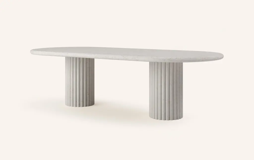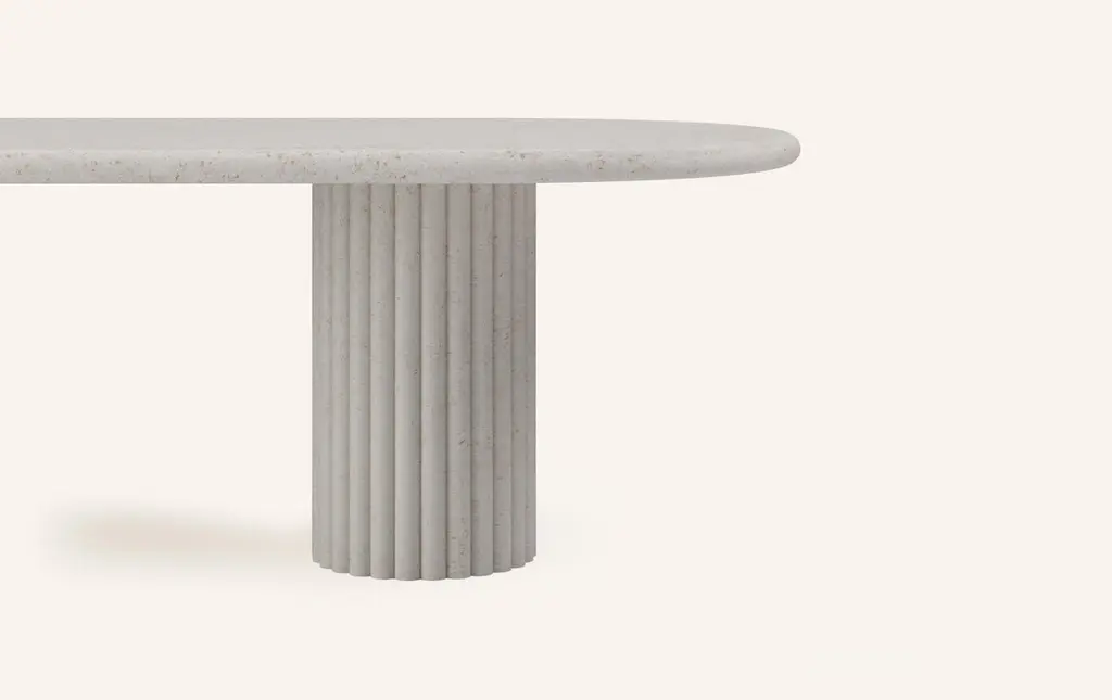 OUR MOST COVETED COLLECTION AND MODERN TWIST ON AN ANCIENT ROMAN CLASSIC. RECENTLY REFRESHED WITH A MORE PLAYFUL AND ROBUST PROFILE.DIMENSIONS:84”L x 42”W x 30”H: - 2.25" THICK TABLE TOP- 14"Ø FLUTED BASE(S) WITH 2" FLUTES- 6.25"Ø CUTOUT IN TABLE TOP WITH 6"Ø INTERLOCK ON BASECONSTRUCTION:TABLE TOP: - 3/4”x 3 SLABS WITH FULL BULLNOSE- HOLE IN TABLE TOP INTERLOCKS WITH BASE OF TABLEBASE:- HOLLOW CONSTRUCTION USING 3/4” STONE SLAB- FELT LINING TO BOTTOM OF BASE FOR FLOOR PROTECTION- STONE FINISH TO TOP OF BASEWEIGHT:84”L x 42”W x 30”H: - GROSS WEIGHT INCLUDING WOOD CRATE 1118LBS