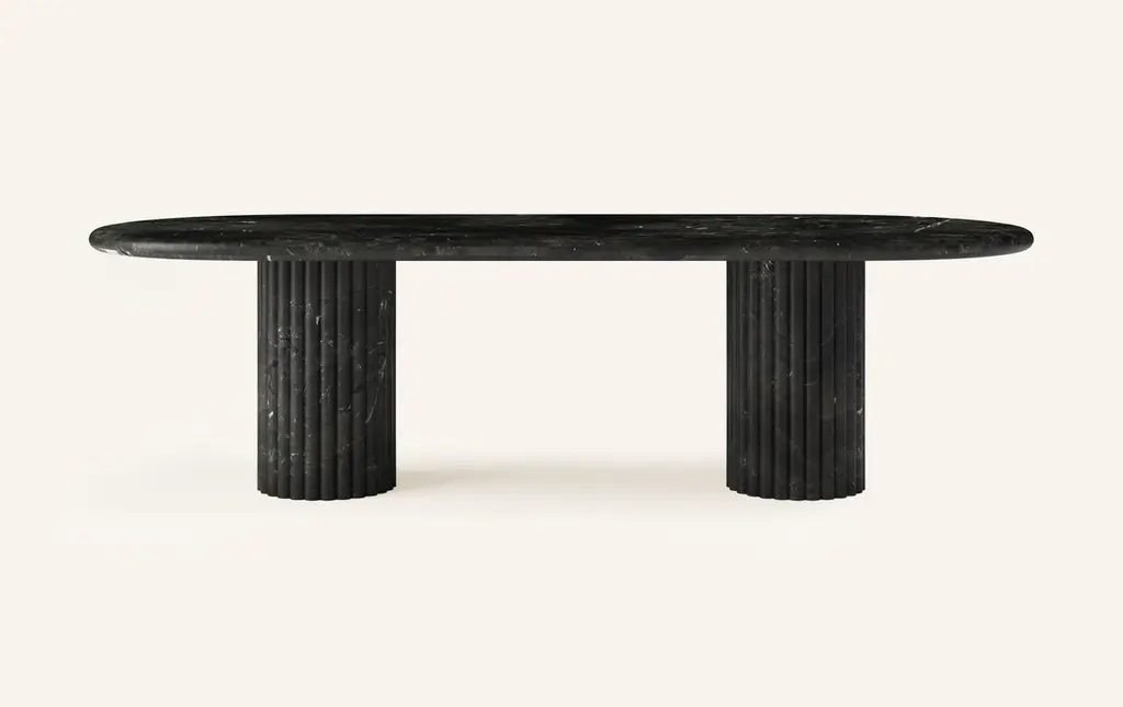 OUR MOST COVETED COLLECTION AND MODERN TWIST ON AN ANCIENT ROMAN CLASSIC. RECENTLY REFRESHED WITH A MORE PLAYFUL AND ROBUST PROFILE.DIMENSIONS:84”L x 42”W x 30”H: - 2.25" THICK TABLE TOP- 14"Ø FLUTED BASE(S) WITH 2" FLUTES- 6.25"Ø CUTOUT IN TABLE TOP WITH 6"Ø INTERLOCK ON BASECONSTRUCTION:TABLE TOP: - 3/4”x 3 SLABS WITH FULL BULLNOSE- HOLE IN TABLE TOP INTERLOCKS WITH BASE OF TABLEBASE:- HOLLOW CONSTRUCTION USING 3/4” STONE SLAB- FELT LINING TO BOTTOM OF BASE FOR FLOOR PROTECTION- STONE FINISH TO TOP OF BASEWEIGHT:84”L x 42”W x 30”H: - GROSS WEIGHT INCLUDING WOOD CRATE 1118LBS