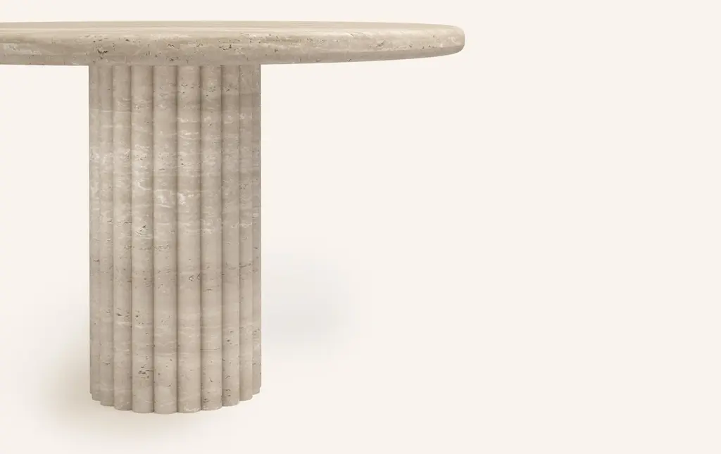 OUR MOST COVETED COLLECTION AND MODERN TWIST ON AN ANCIENT ROMAN CLASSIC. RECENTLY REFRESHED WITH A MORE PLAYFUL AND ROBUST PROFILE.DIMENSIONS:48”L x 48”W x 30”H: - 2.25" THICK TABLE TOP- 14"Ø FLUTED BASE WITH 2" FLUTES- 6.25"Ø CUTOUT IN TABLE TOP WITH 6"Ø INTERLOCK ON BASECONSTRUCTION:TABLE TOP: - 3/4”x 3 SLABS WITH FULL BULLNOSE- HOLE IN TABLE TOP INTERLOCKS WITH BASE OF TABLEBASE:- HOLLOW CONSTRUCTION USING 3/4” STONE SLAB- FELT LINING TO BOTTOM OF BASE FOR FLOOR PROTECTION- STONE FINISH TO TOP OF BASEWEIGHT:48”L x 48”W x 30”H: - GROSS WEIGHT INCLUDING WOOD CRATE 718LBS