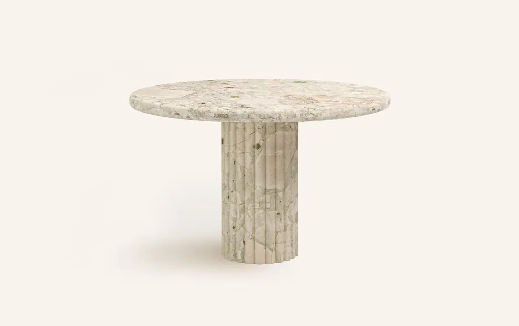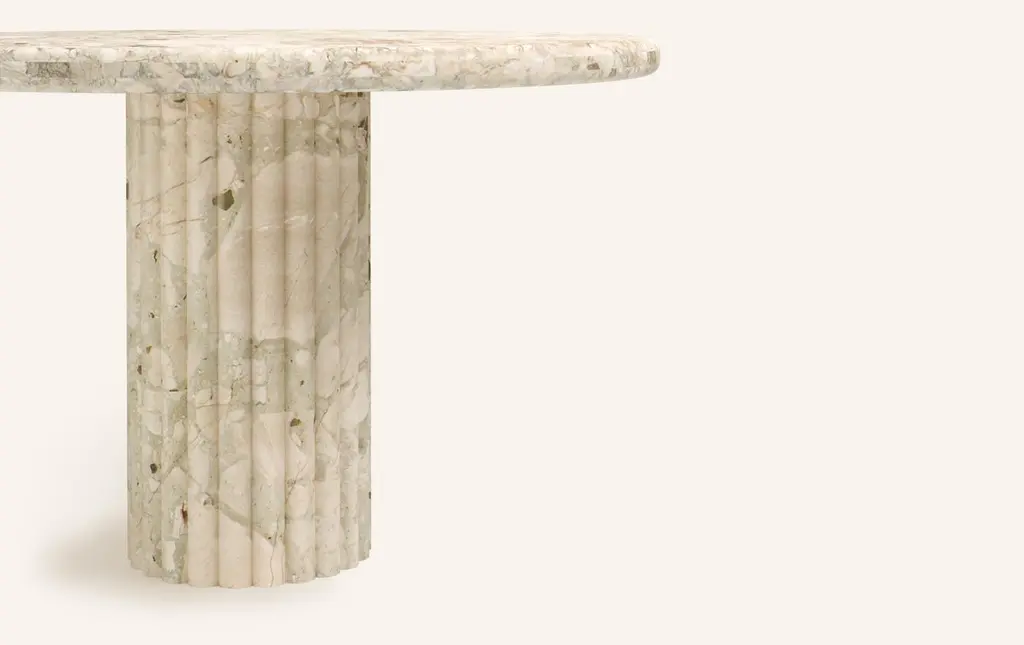 OUR MOST COVETED COLLECTION AND MODERN TWIST ON AN ANCIENT ROMAN CLASSIC. RECENTLY REFRESHED WITH A MORE PLAYFUL AND ROBUST PROFILE.DIMENSIONS:54”L x 54”W x 30”H: - 2.25" THICK TABLE TOP- 16"Ø FLUTED BASE WITH 2" FLUTES- 6.25"Ø CUTOUT IN TABLE TOP WITH 6"Ø INTERLOCK ON BASECONSTRUCTION:TABLE TOP: - 3/4”x 3 SLABS WITH FULL BULLNOSE- HOLE IN TABLE TOP INTERLOCKS WITH BASE OF TABLEBASE:- HOLLOW CONSTRUCTION USING 3/4” STONE SLAB- FELT LINING TO BOTTOM OF BASE FOR FLOOR PROTECTION- STONE FINISH TO TOP OF BASEWEIGHT:54”L x 54”W x 30”H: - GROSS WEIGHT INCLUDING WOOD CRATE 900LBS