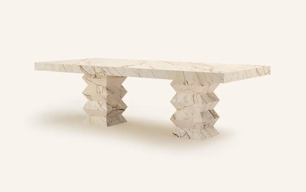 A BOLD AND EXPRESSIVE FORM WHERE GEOMETRY AND HARMONY COLLIDE. ITALIAN FOR WRINKLE, 'GRINZA'S ZIG-ZAG STRUCTURE' IS BOTH TIMELESS AND ELEGANT. DIMENSIONS:118”L x 48”W x 32”H: - 4" THICK TABLE TOP- 16”L x 16”W WRINKLED BASE(S) WITH 4" FOLDSCONSTRUCTION:TABLE TOP: - 3/4” SLAB(S) WITH 4” MITERED EDGE- FELT LINING TO BOTTOM OF TABLE TOPBASE:- HOLLOW CONSTRUCTION USING 3/4” STONE SLAB- FELT LINING TO BOTTOM OF BASE FOR FLOOR PROTECTION- STONE FINISH TO TOP OF BASEWEIGHT:118”L x 48”W x 32”H: - GROSS WEIGHT INCLUDING WOOD CRATE 1560LBS