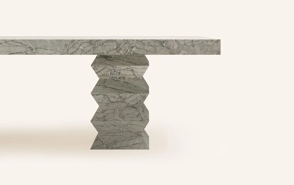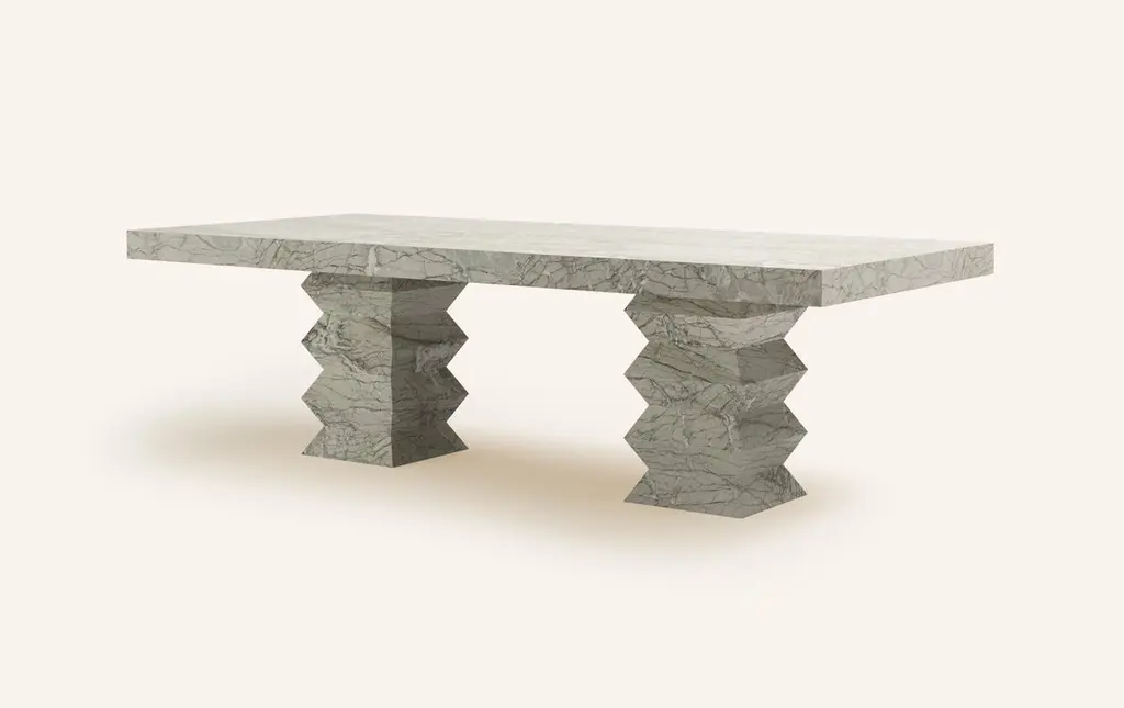 A BOLD AND EXPRESSIVE FORM WHERE GEOMETRY AND HARMONY COLLIDE. ITALIAN FOR WRINKLE, 'GRINZA'S ZIG-ZAG STRUCTURE' IS BOTH TIMELESS AND ELEGANT. DIMENSIONS:96”L x 42”W x 32”H: - 4" THICK TABLE TOP- 16”L x 16”W WRINKLED BASE(S) WITH 4" FOLDSCONSTRUCTION:TABLE TOP: - 3/4” SLAB(S) WITH 4” MITERED EDGE- FELT LINING TO BOTTOM OF TABLE TOPBASE:- HOLLOW CONSTRUCTION USING 3/4” STONE SLAB- FELT LINING TO BOTTOM OF BASE FOR FLOOR PROTECTION- STONE FINISH TO TOP OF BASEWEIGHT:96”L x 42”W x 32”H: - GROSS WEIGHT INCLUDING WOOD CRATE 1244LBS