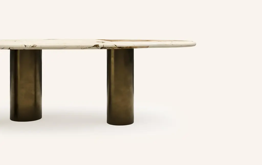 ‘LAGO’, ITALIAN FOR ‘LAKE’, HAS INSPIRED A FORM DERIVED FROM NATURE, TEXTURED WITH LUXURIOUS STONES AND METALS. THE COLLECTION ENCOURAGES NESTING AND LAYERING IN ITS AVAILABLE FORMS.DIMENSIONS: 96”L x 42”W x 30”H: - 3 x 9"Ø ROUND BASE- 3 x 10"Ø CUTOUT(S) ON UNDERSIDE OF TABLE TOPCONSTRUCTION:TABLE TOP: - 3/4”x 2 SLABS WITH FULL BULLNOSE EDGE- HOLE(S) IN TABLE TOP INTERLOCKS WITH BASE OF TABLEBASE:- SOLID STONE CONSTRUCTION OR 304 STAINLESS STEEL WITH ANTIQUE BRONZE FINISH- FELT LINING TO BOTTOM OF BASE FOR FLOOR PROTECTIONWEIGHT:96”L x 42”W x 30”H WITH ANTIQUE BRONZE LEGS: - GROSS WEIGHT INCLUDING WOOD CRATE 864LBS