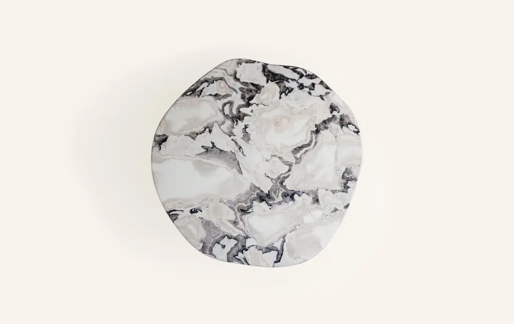 ‘LAGO’, ITALIAN FOR ‘LAKE’, HAS INSPIRED A FORM DERIVED FROM NATURE, TEXTURED WITH LUXURIOUS STONES AND METALS. THE COLLECTION ENCOURAGES NESTING AND LAYERING IN ITS AVAILABLE FORMS.DIMENSIONS: 54”L x 54”W x 30”H: - 17"Ø ROUND BASE- 18"Ø CUTOUT ON UNDERSIDE OF TABLE TOPCONSTRUCTION:TABLE TOP: - 3/4”x 2 SLABS WITH FULL BULLNOSE EDGE- HOLE(S) IN TABLE TOP INTERLOCKS WITH BASE OF TABLEBASE:- SOLID STONE CONSTRUCTION OR 304 STAINLESS STEEL WITH ANTIQUE BRONZE FINISH- FELT LINING TO BOTTOM OF BASE FOR FLOOR PROTECTIONWEIGHT:54”L x 54”W x 30”H WITH ANTIQUE BRONZE LEGS: - GROSS WEIGHT INCLUDING WOOD CRATE 718LBS
