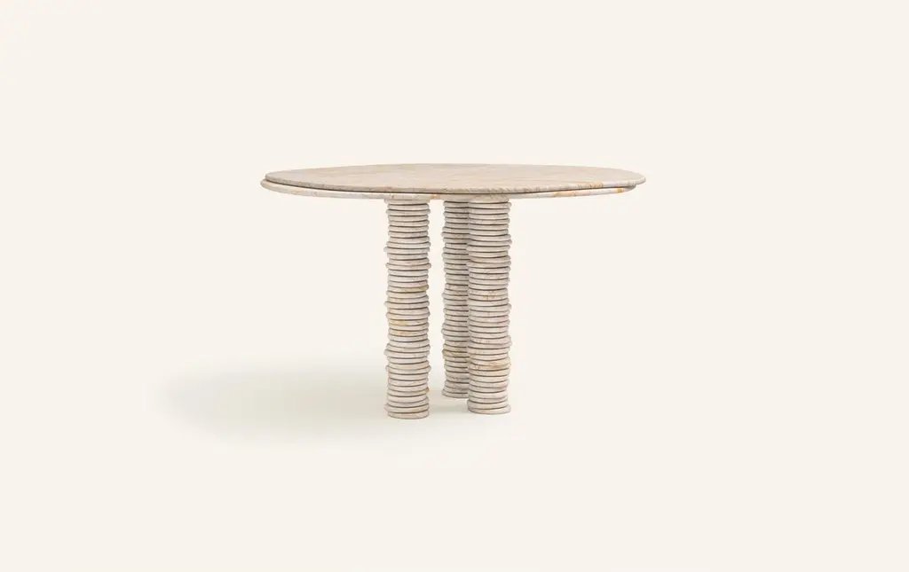 'ONDA', ITALIAN FOR 'WAVE', HAS INSPIRED A FREEFORM ORGANIC BODY, HEROING A COMPLEX AND TEXTURED COLLECTION. COMPRISING SIDE TABLES FOR LAYERING, COFFEE TABLES AND DINING TABLES.DIMENSIONS:42”L x 42”W x 29-3/4”H: - 1.5" THICK TABLE TOP- 3 x 6"Ø 3/4" FREEFORM ROUND STAGGERED STACKEDSLAB LEGS- 1.5”Ø CUTOUT IN TABLE TOP WITH 1.25”Ø INTERLOCK ON BASECONSTRUCTION:TABLE TOP: - 3/4”x 2 LAMINATED SLABS WITH FULL BULLNOSE- HOLE IN TABLE TOP INTERLOCKS WITH BASE OF TABLEBASE:- SOLID CONSTRUCTION USING 3/4” STONE SLAB(S) STACKED- FELT LINING TO BOTTOM OF BASE FOR FLOOR PROTECTION- STONE FINISH TO TOP OF BASEWEIGHT:42”L x 42”W x 29-3/4”H: - GROSS WEIGHT INCLUDING WOOD CRATE 591LBS