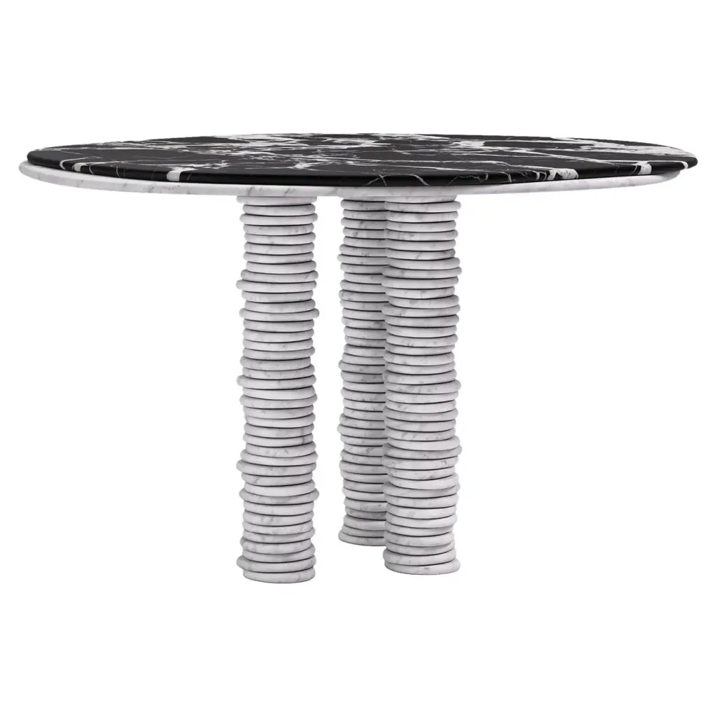 'ONDA', ITALIAN FOR 'WAVE', HAS INSPIRED A FREEFORM ORGANIC BODY, HEROING A COMPLEX AND TEXTURED COLLECTION. COMPRISING SIDE TABLES FOR LAYERING, COFFEE TABLES AND DINING TABLES.DIMENSIONS:54”L x 54”W x 29-3/4”H: - 1.5" THICK TABLE TOP- 4 x 6"Ø 3/4" FREEFORM ROUND STAGGERED STACKEDSLAB LEGS- 1.5”Ø CUTOUT IN TABLE TOP WITH 1.25”Ø INTERLOCK ON BASECONSTRUCTION:TABLE TOP: - 3/4”x 2 LAMINATED SLABS WITH FULL BULLNOSE- HOLE IN TABLE TOP INTERLOCKS WITH BASE OF TABLEBASE:- SOLID CONSTRUCTION USING 3/4” STONE SLAB(S) STACKED- FELT LINING TO BOTTOM OF BASE FOR FLOOR PROTECTION- STONE FINISH TO TOP OF BASEWEIGHT:54”L x 54”W x 29-3/4”H: - GROSS WEIGHT INCLUDING WOOD CRATE 821LBS