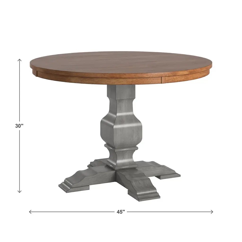 About This Product Gather around and dine in style with this classic solid wood dining table. Crafted with traditional simplicity in mind, it features a circular top and matching apron in a contrasting oak hue with beautiful grain patterns. Standing atop a pedestal-style base with carved details and a solid finish, it makes for the ideal focal point for your dining ensemble. This dining table is sized just right for cozy family meals, seating up to four people. Measuring only 45'' long, it easily fits into smaller spaces without sacrificing style or quality. Not Included: Chairs