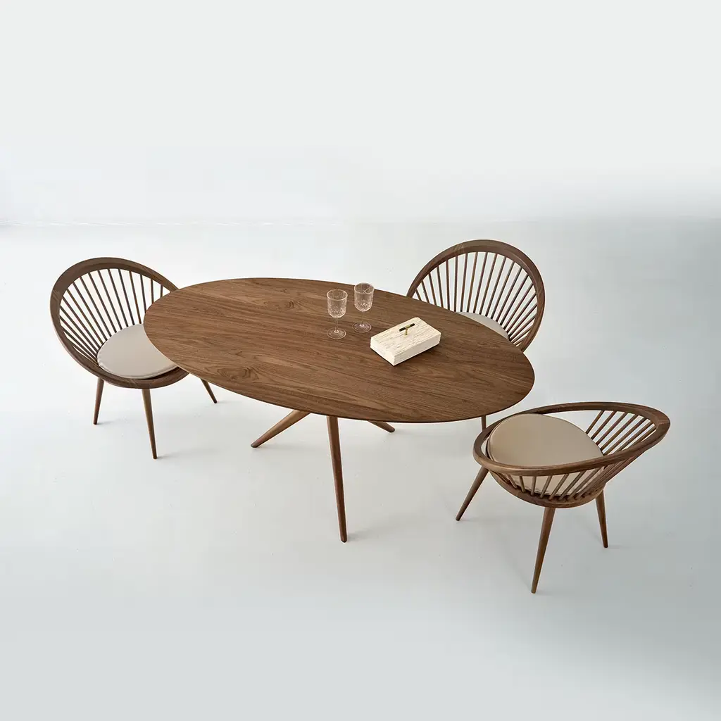 With its elliptical top and sculptural base, this table transforms walnut into an artful centerpiece. The grain of the Canaletto walnut veneer flows uninterrupted across the surface, creating a sense of movement and vitality. Its eco-friendly water-based Havana finish preserves the wood’s natural beauty while emphasizing its artisanal origins. Supported by gracefully intersecting solid wood legs, this table is a testament to craftsmanship, ideal for both intimate dining and statement settings.