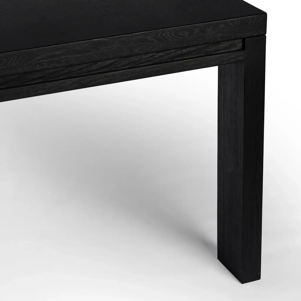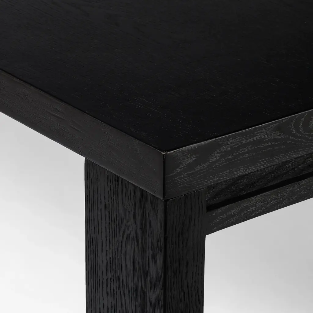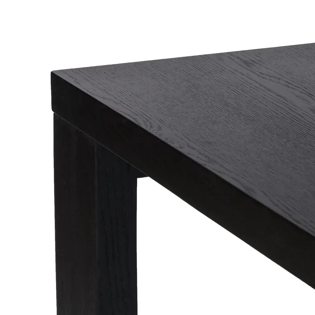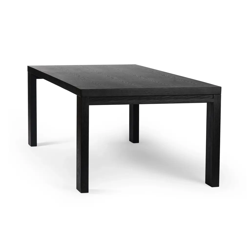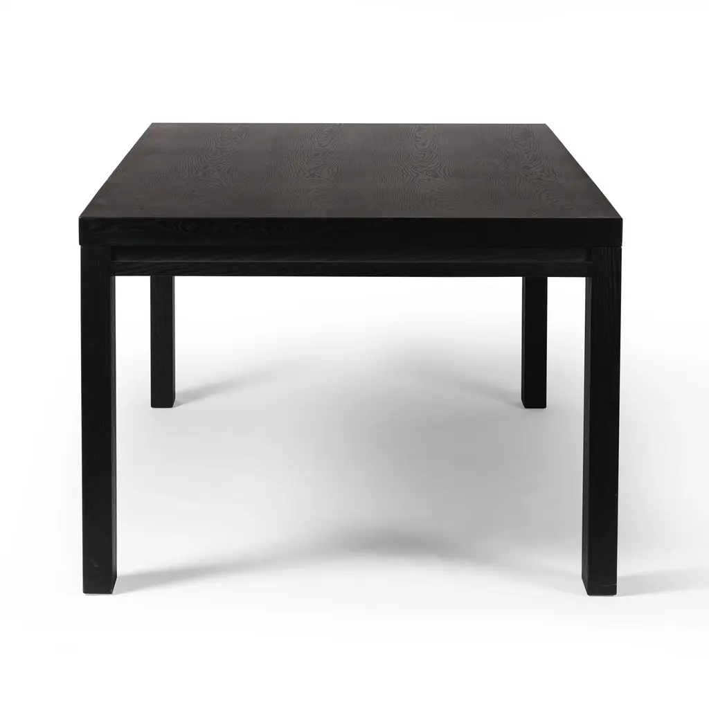 Angled legs place a modern twist on the timeless Parsons table. Versatile black-finished oak moves between styles and color palettes with ease. Seats up to 10 comfortably.