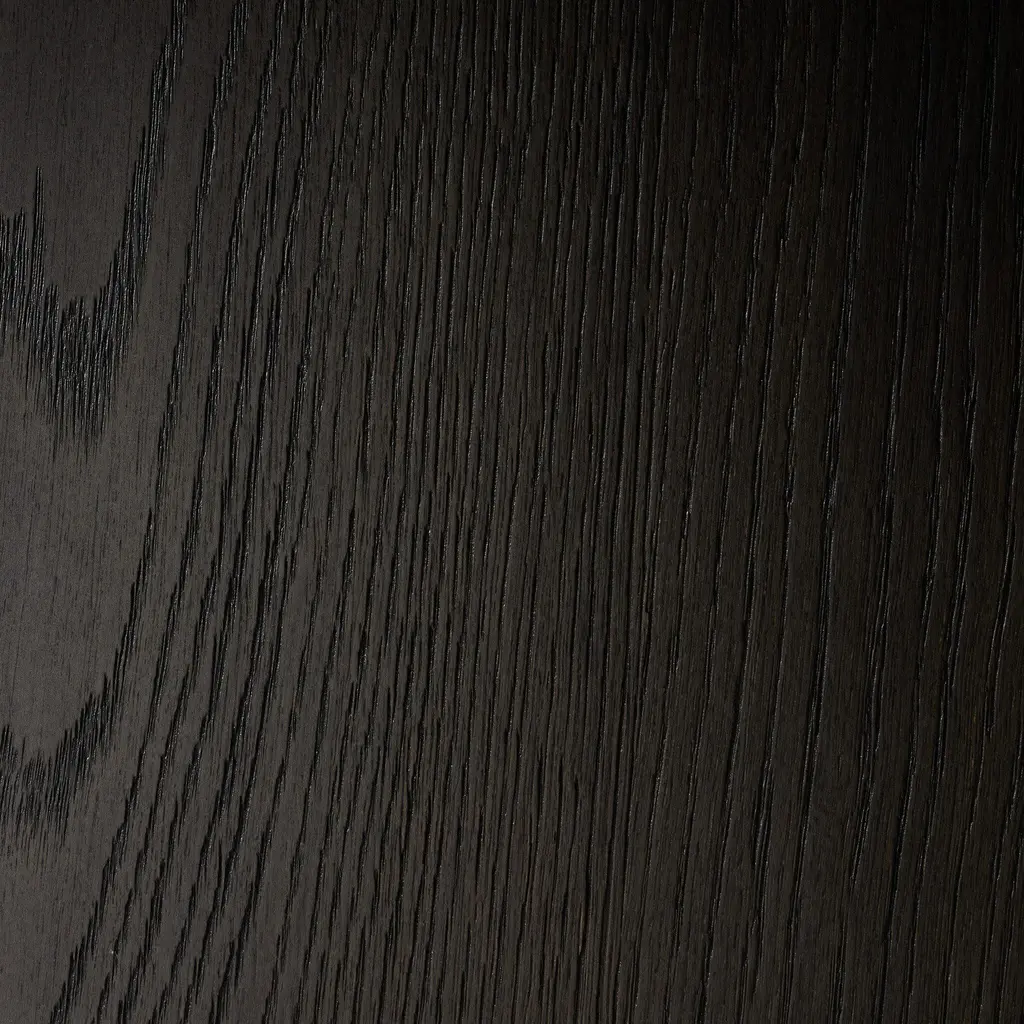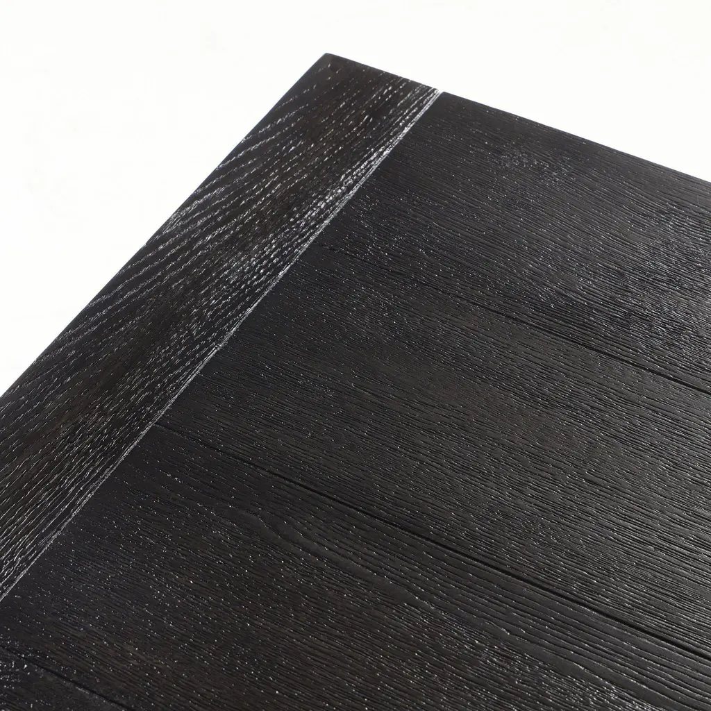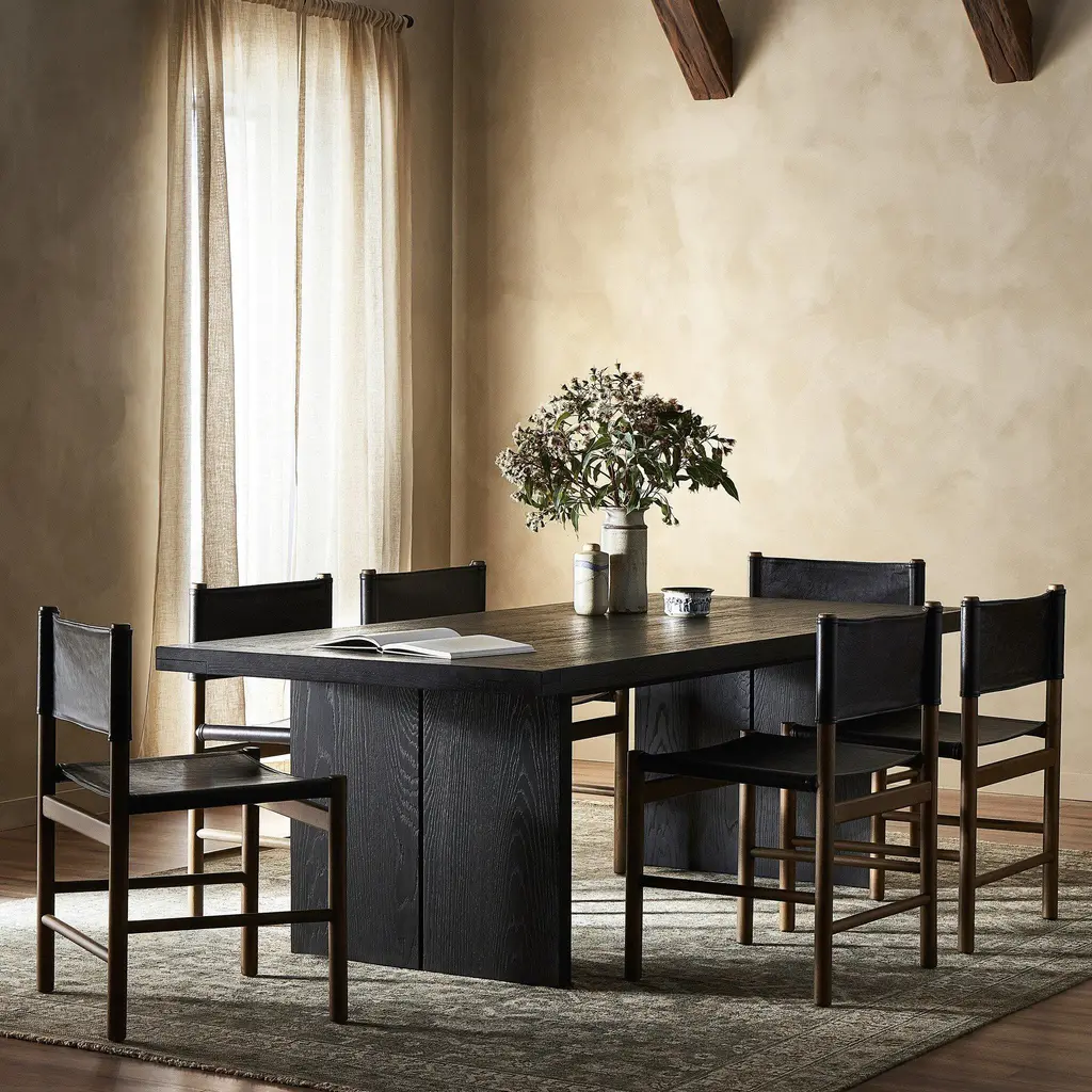 Black-finished oak shapes a streamlined dining table with a rich yet minimalist look. Seats 8.
