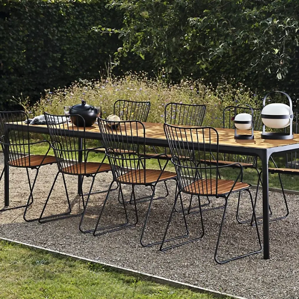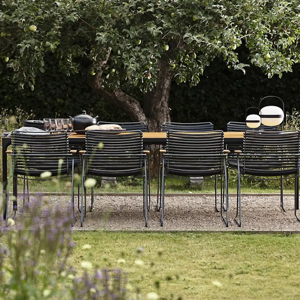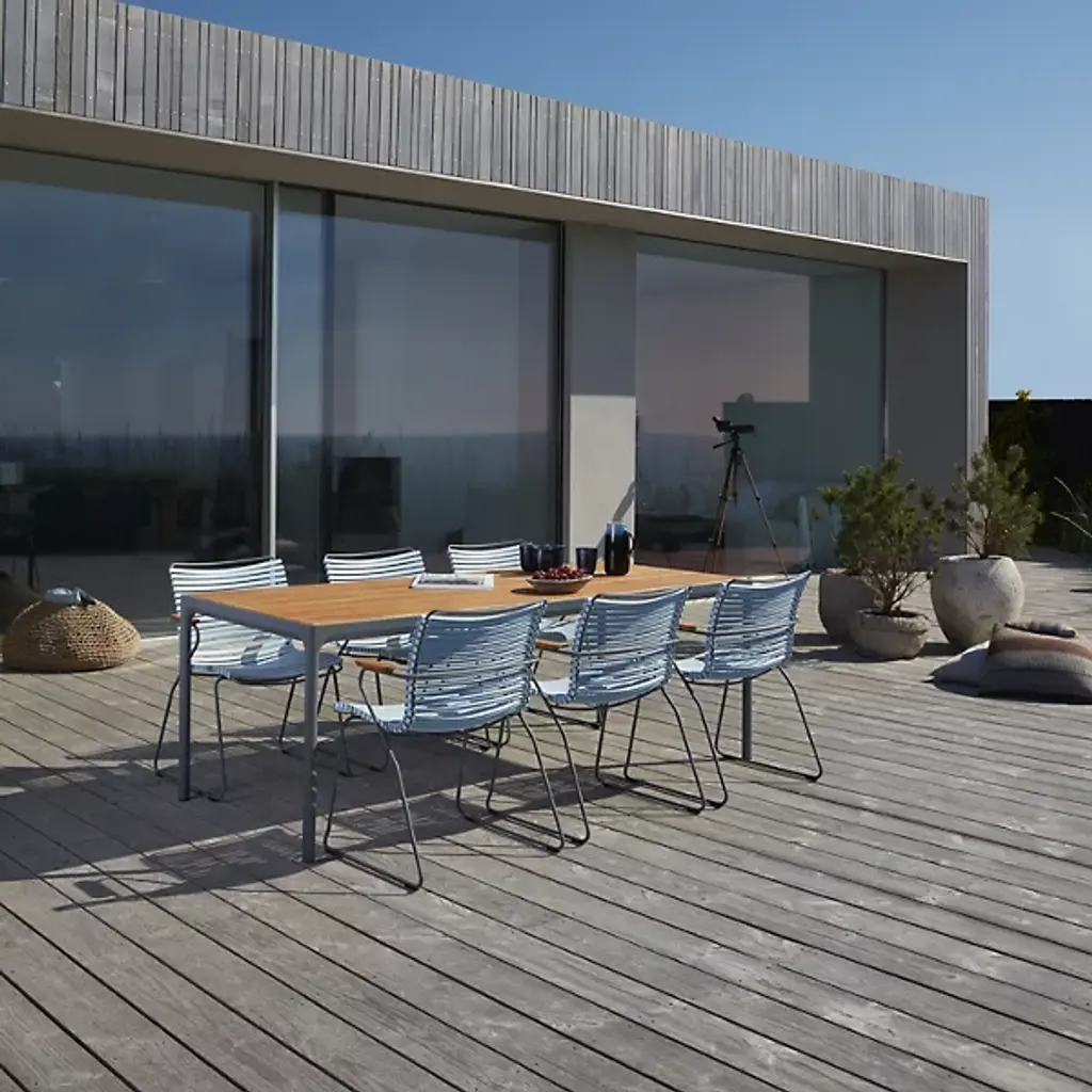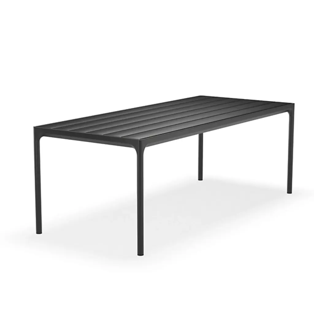 The Four Outdoor Dining Table Table from Houe is straightforward in name, comfort, and durability. Four legs stand with a slim profile to maximize room for one’s lower body. These legs transition into a rectilinear frame with extruded accents for a sophisticated look. The overall base shares a metal construction designed to withstand the elements outdoors. Up above, a slatted tabletop gives a nod to the classic picnic table. While catching the eyes, this slatted pattern filters water through its linear crevices for simple maintenance.