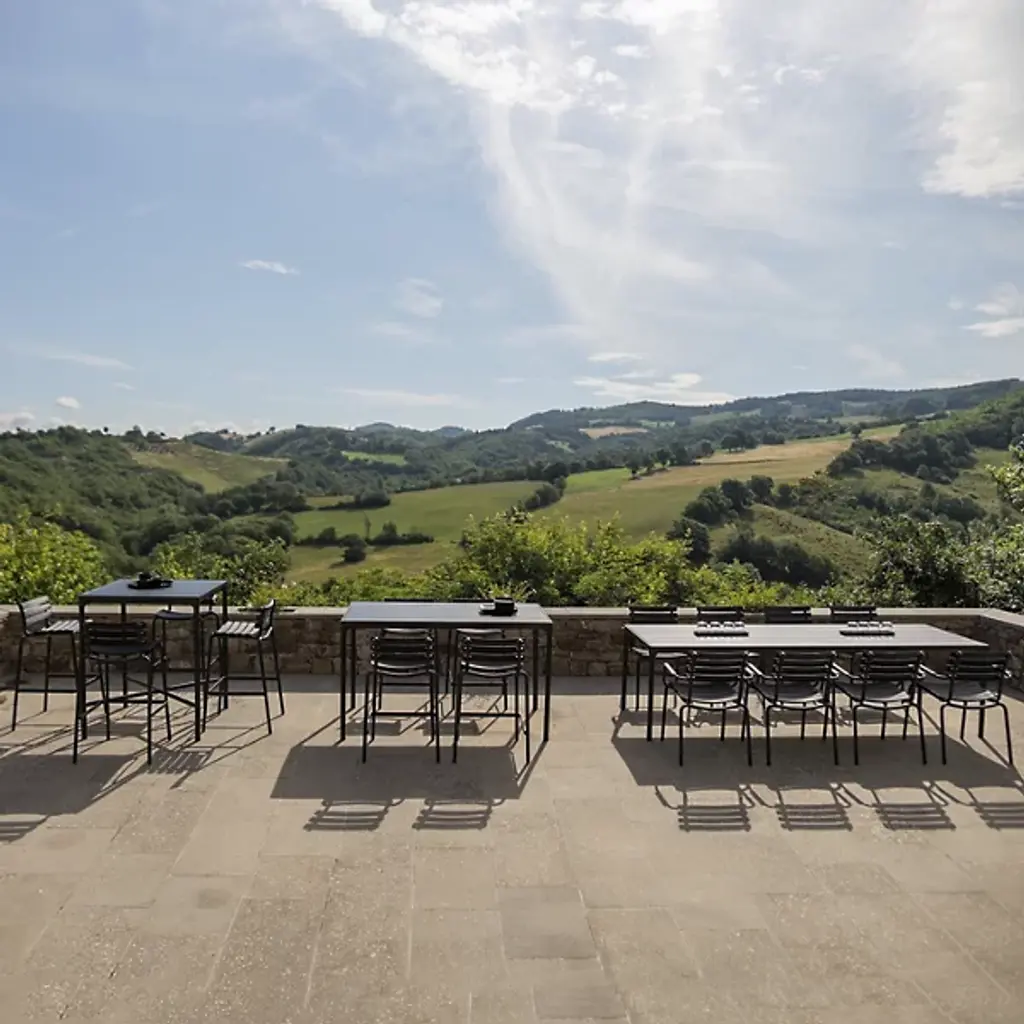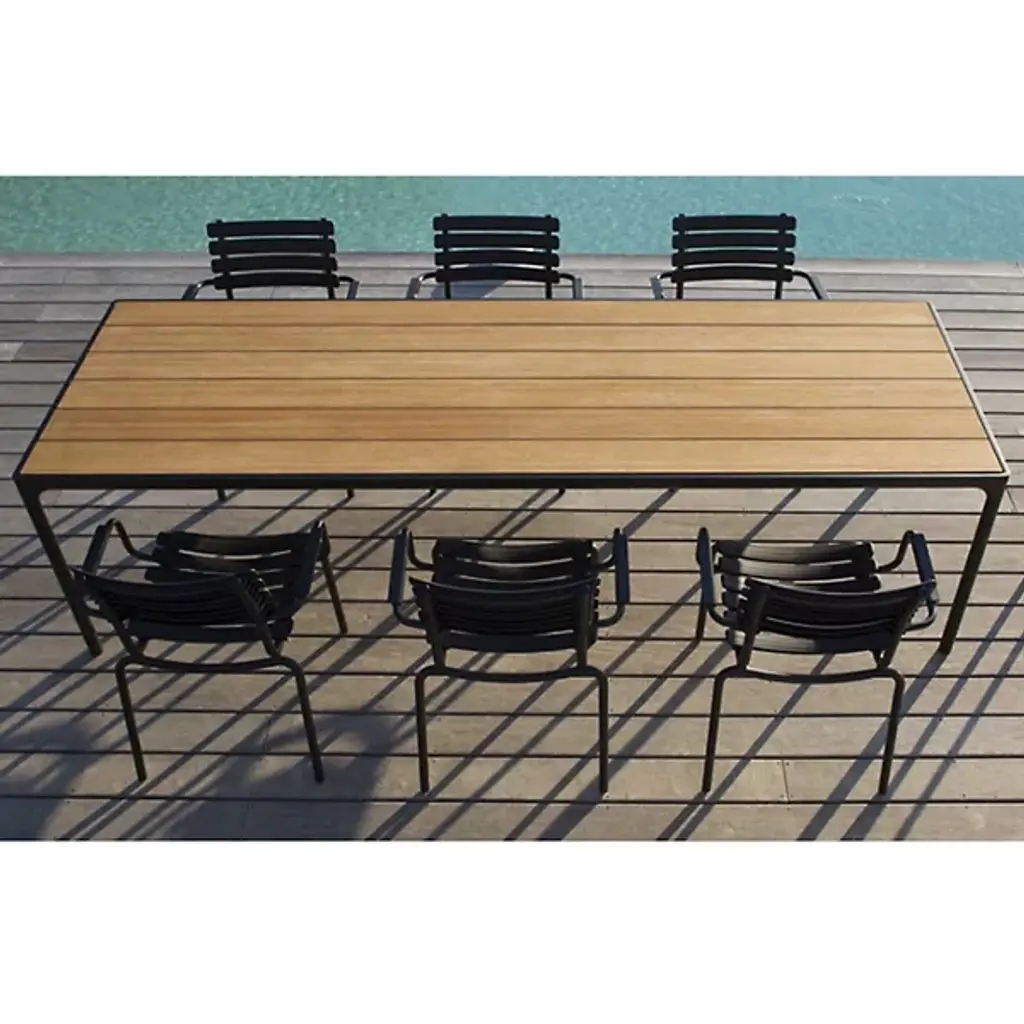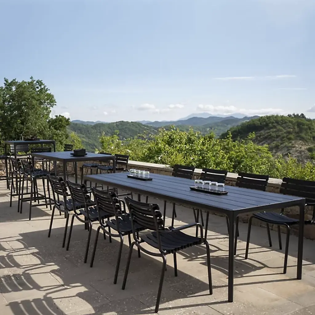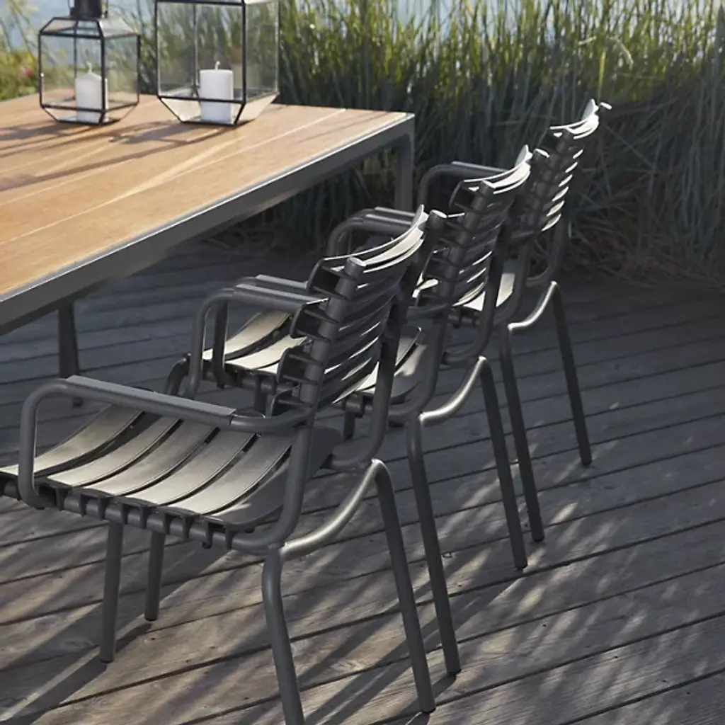 The Four Outdoor Dining Table Table from Houe is straightforward in name, comfort, and durability. Four legs stand with a slim profile to maximize room for one’s lower body. These legs transition into a rectilinear frame with extruded accents for a sophisticated look. The overall base shares a metal construction designed to withstand the elements outdoors. Up above, a slatted tabletop gives a nod to the classic picnic table. While catching the eyes, this slatted pattern filters water through its linear crevices for simple maintenance.
